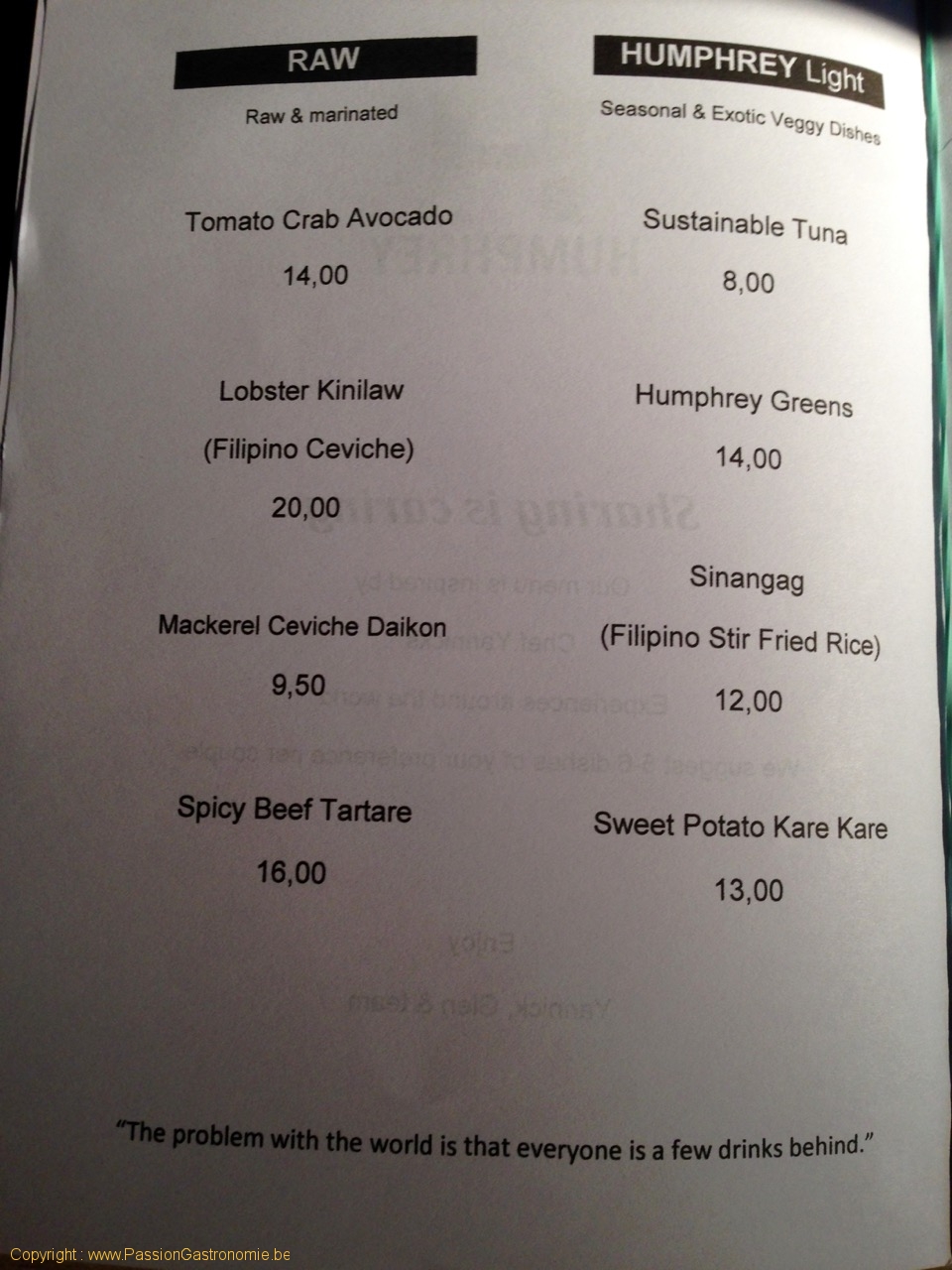 La carte (Raw et Light) du restaurant Humphrey à Bruxelles @Humphrey