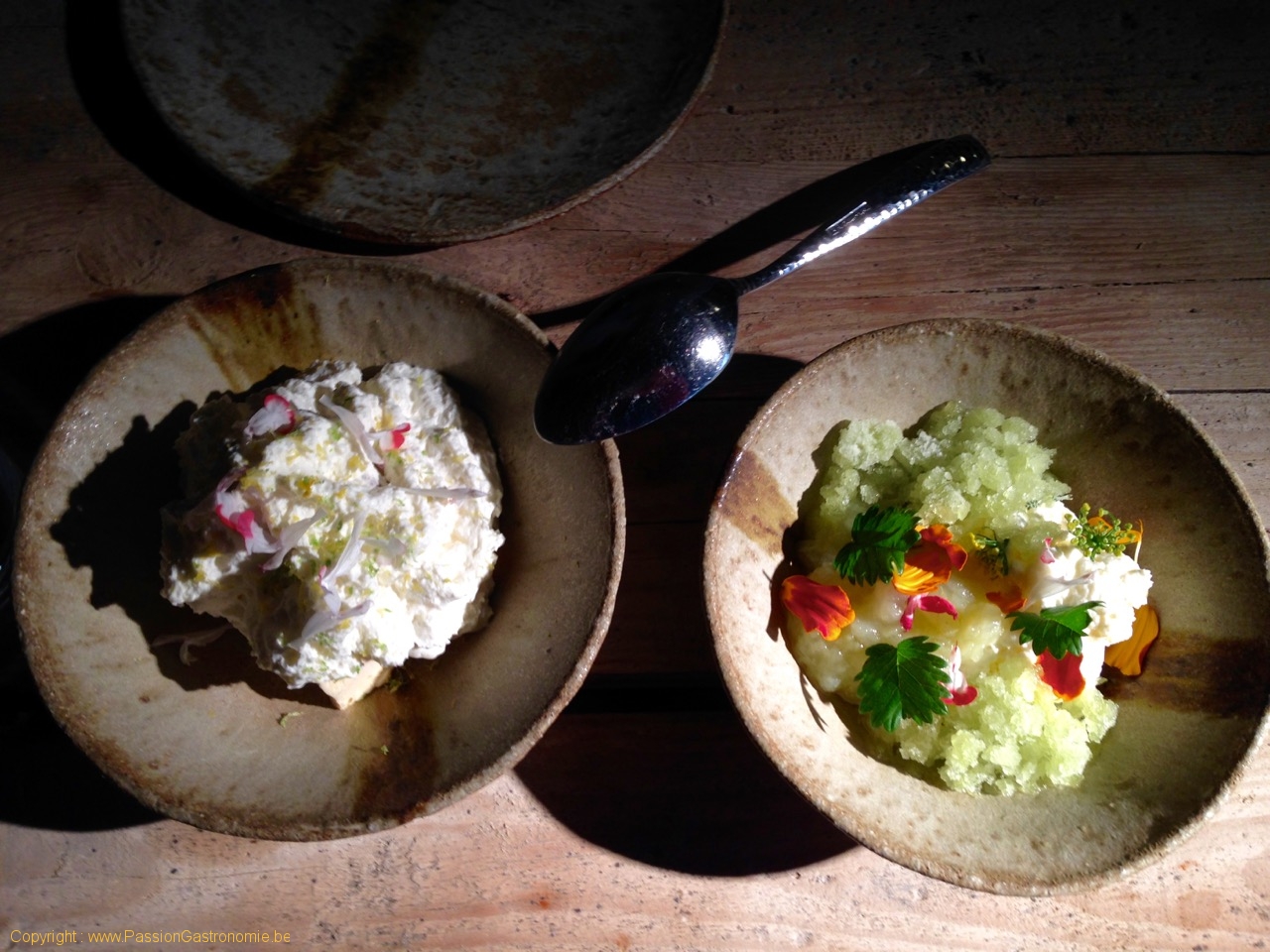Yahourt, mousse de pomme, sapin, granité (Yogurt mousse green apple pine granité) – à droite sur la photo.