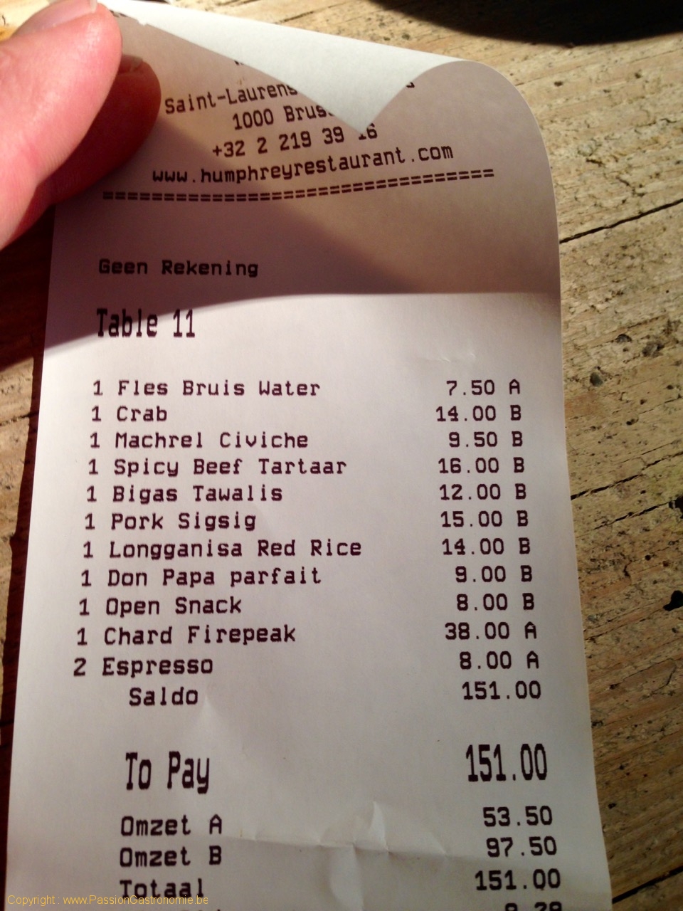 L'addition au restaurant Humphrey à Bruxelles @Humphrey