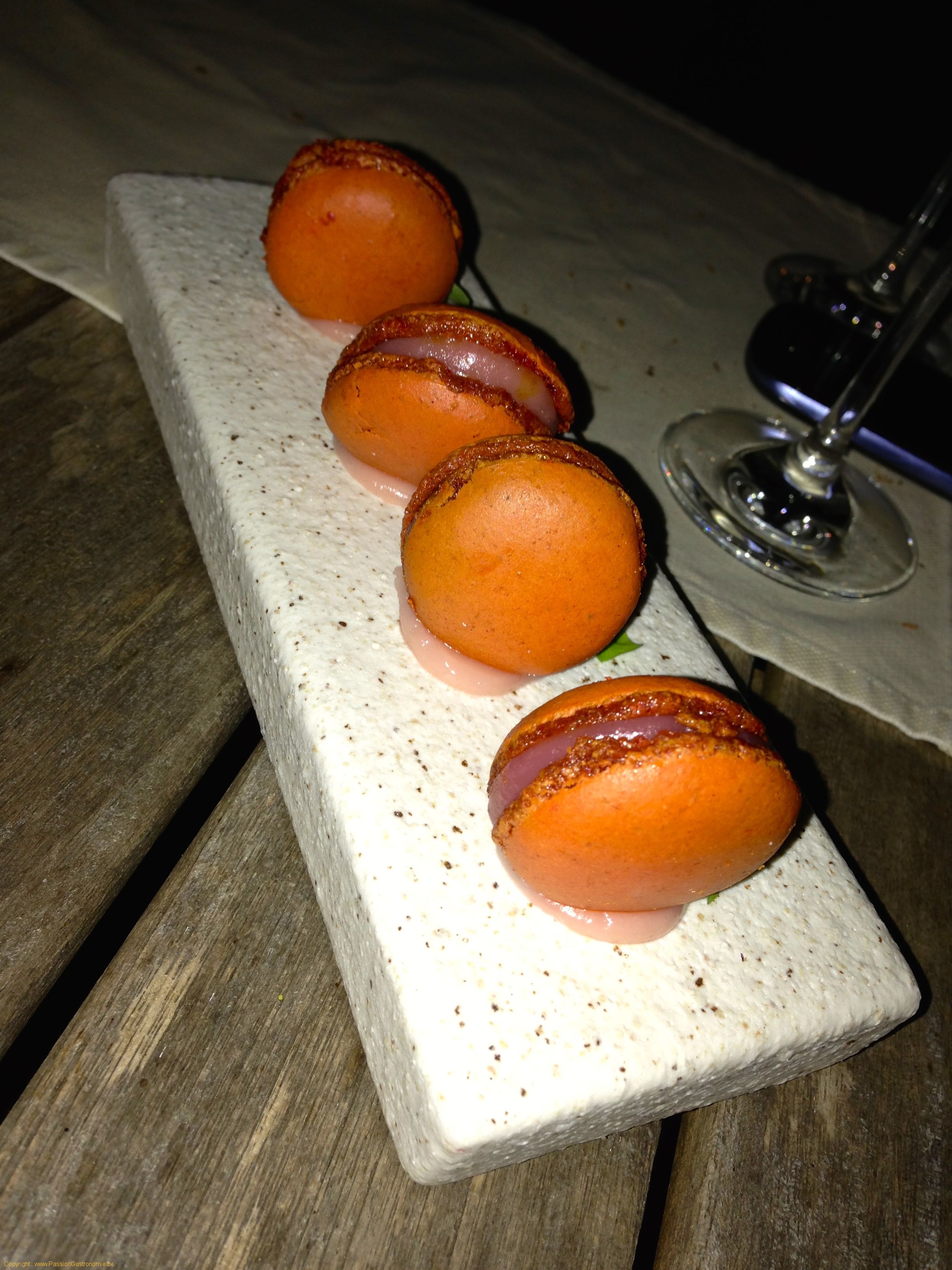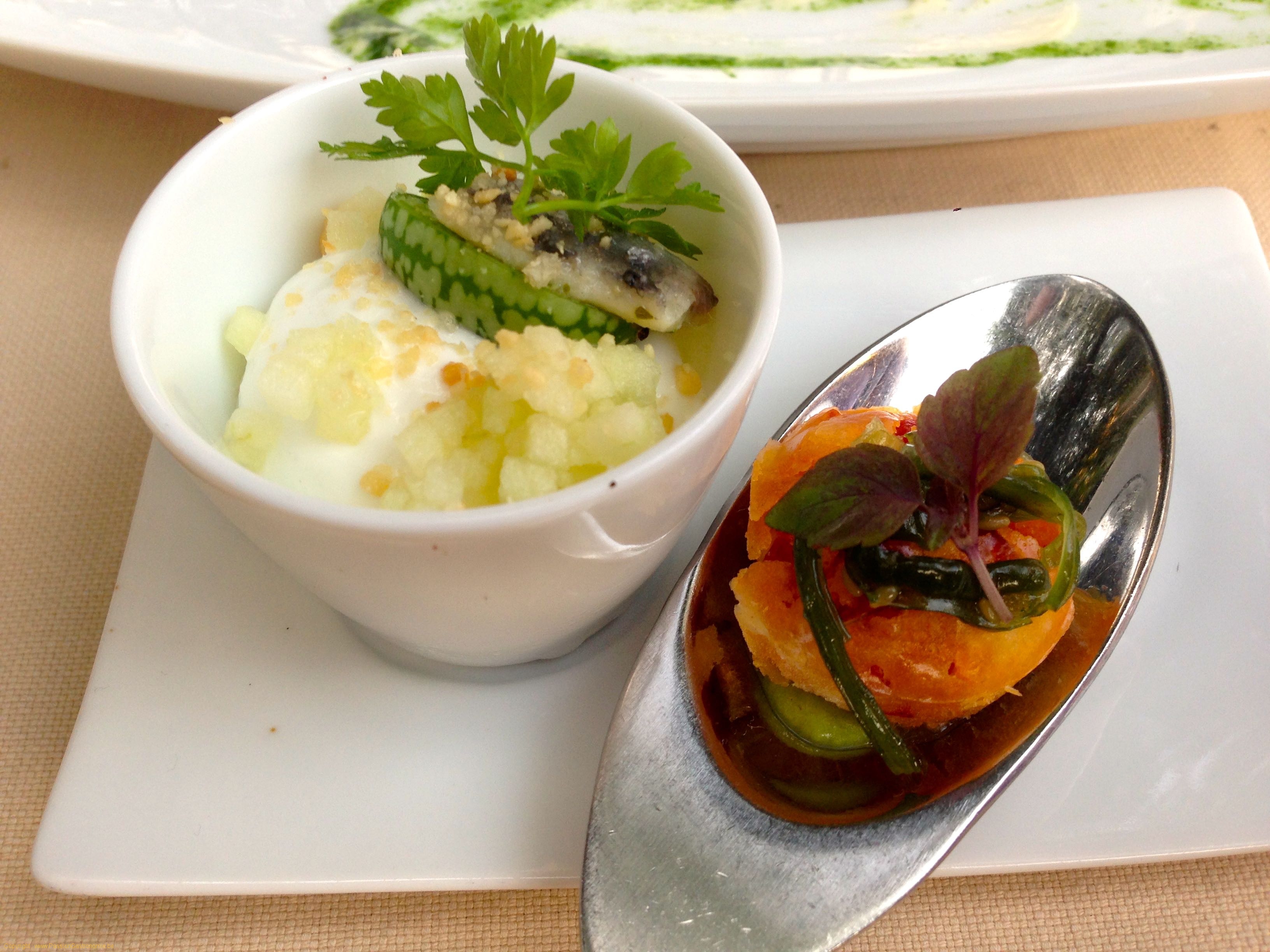 Mise en bouche : Croquette de crevettes, tomate, mayonnaise et coulis de persil