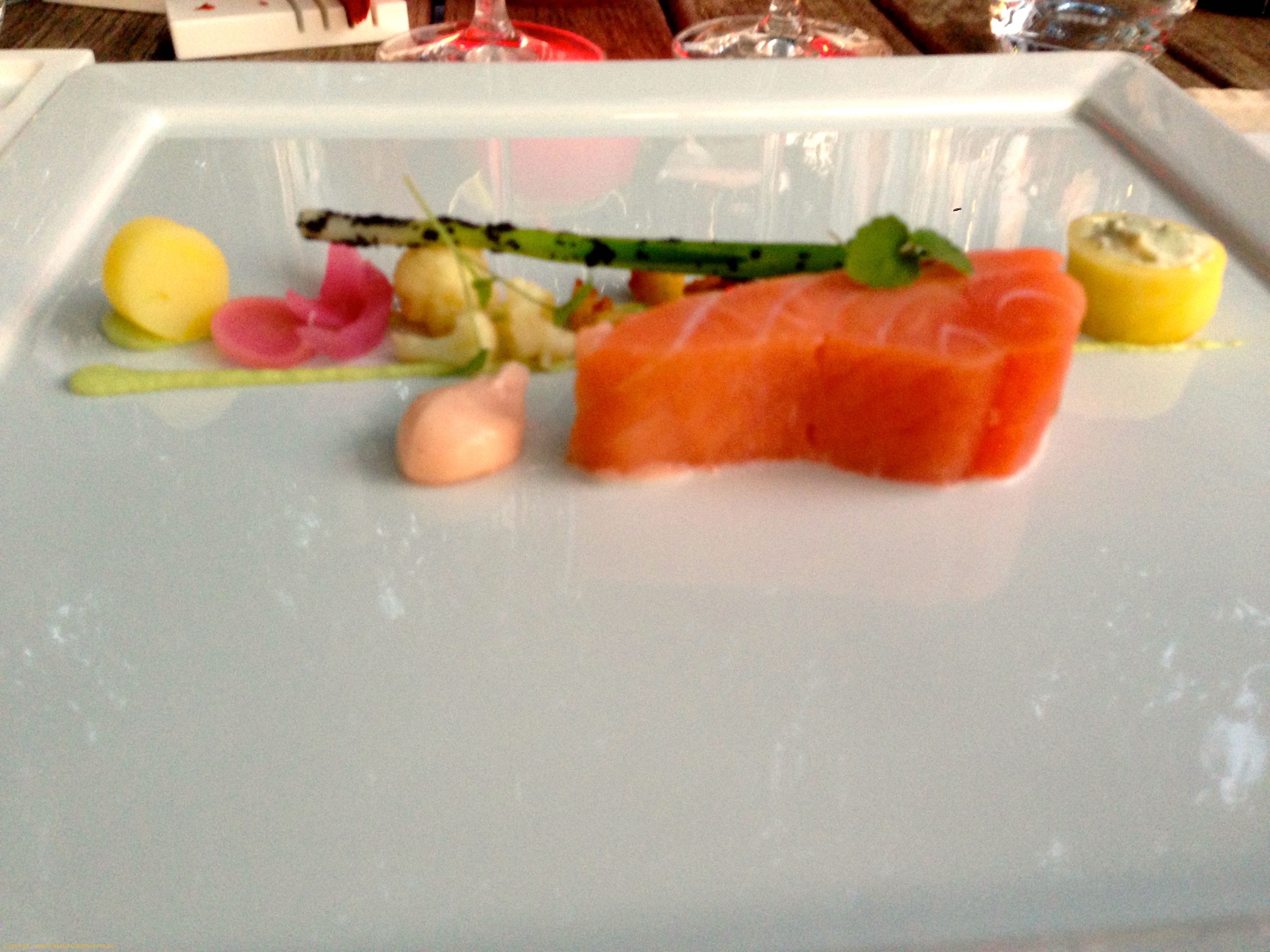 Minute de saumon « Salma» légèrement fumée par leurs soins, jeunes poireaux à l’encre de sèche, œufs de saumon, pickles et sauce gribiche