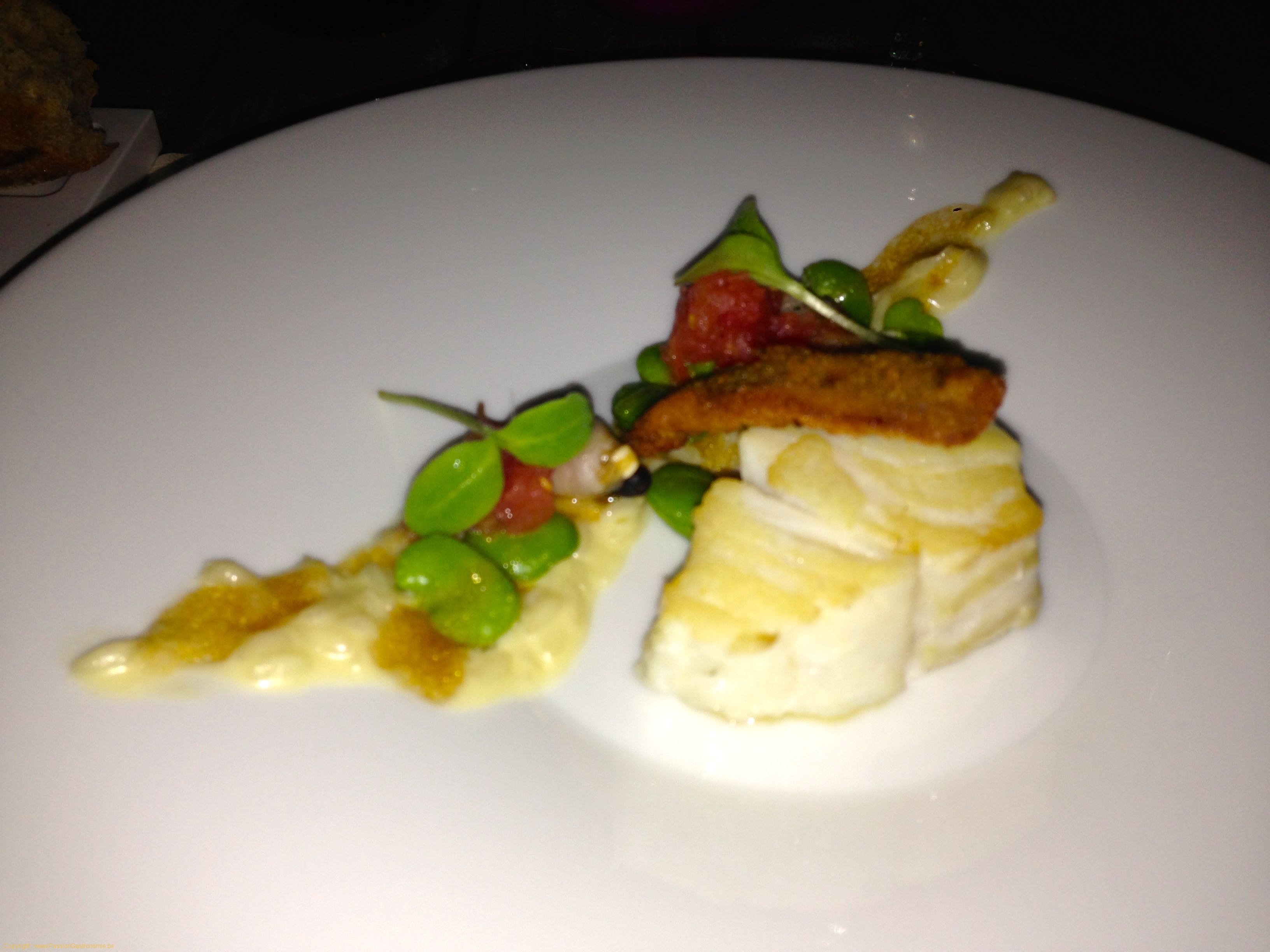 Cabillaud demi sel, pancetta, moules, anchois frais, risotto, fèves des marais et tomates