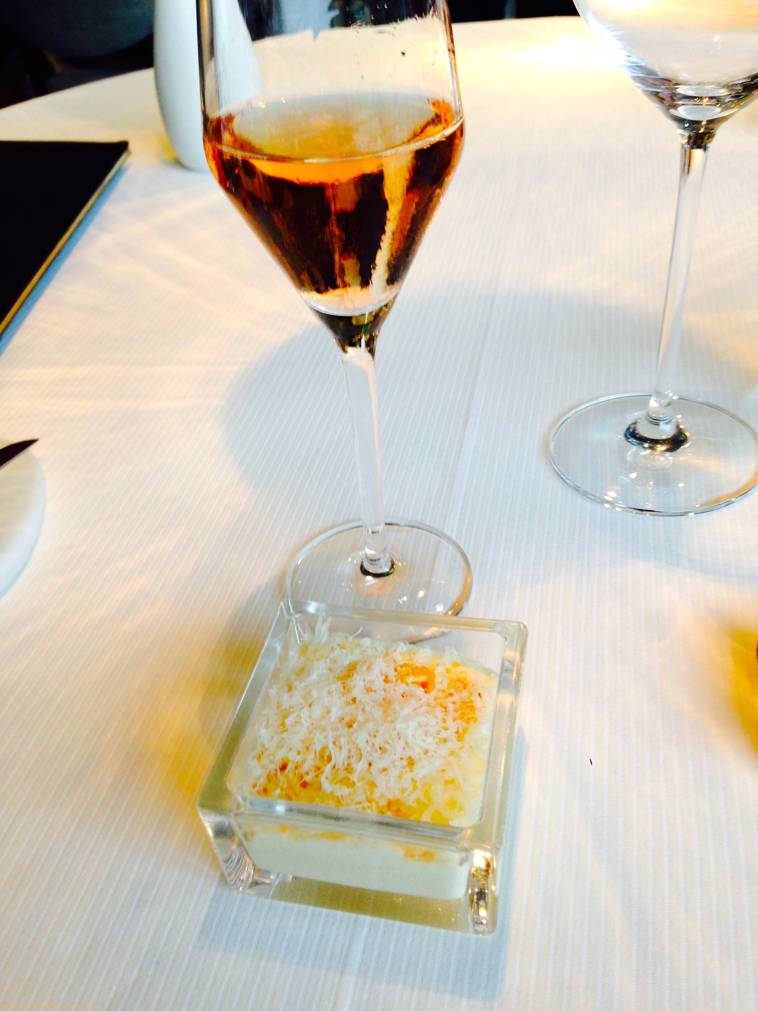 Mise en bouche : Espuma de pommes de terre fumées marinées au whisky , rapée de parmesan. Champagne rosé : 25 euros la coupe. Mon seul bémol du repas.