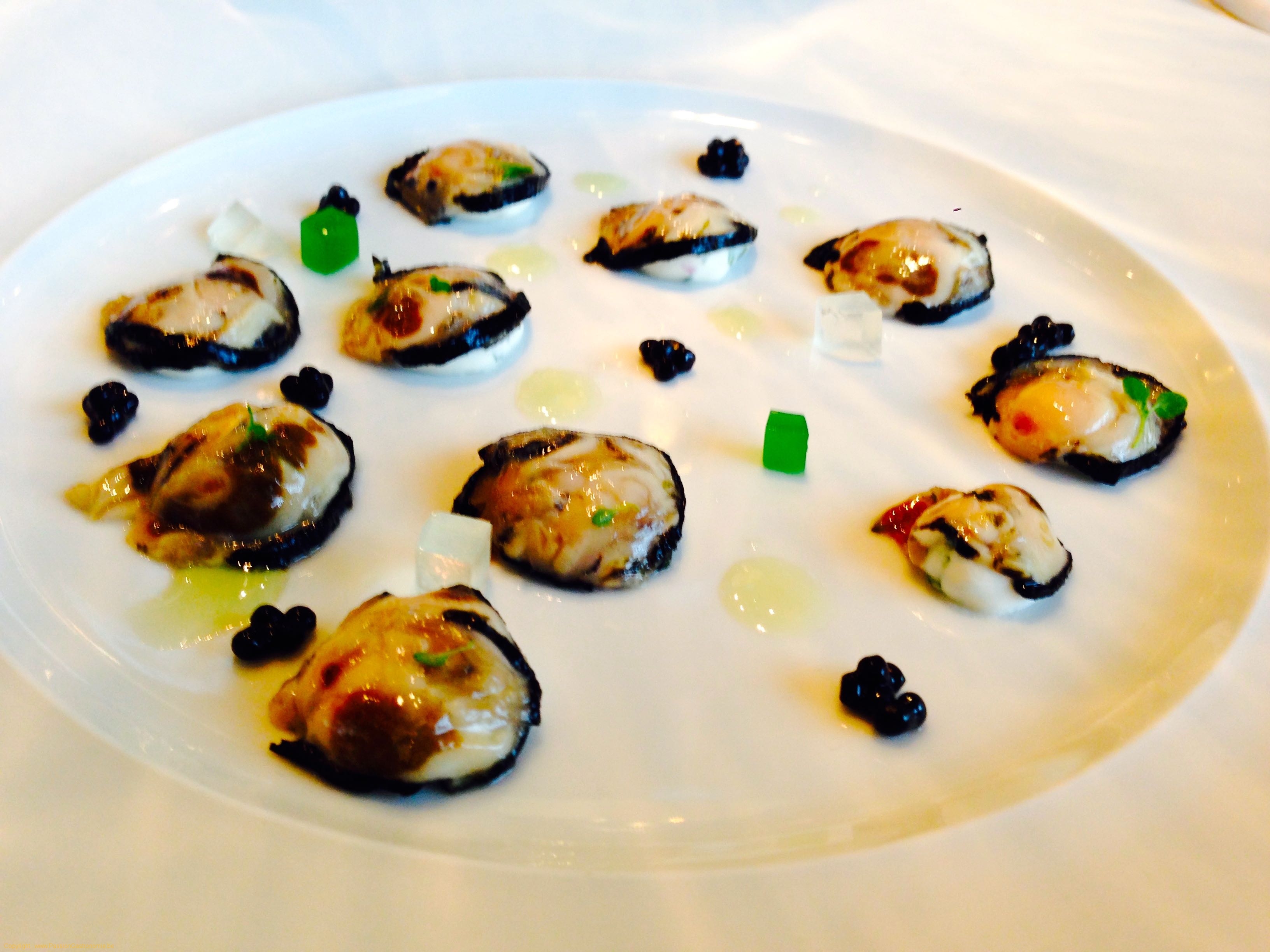 Les Bijoux d’huitres « Perle Blanche », menthe corse et gelée de vodka-tonic. C’est un plat qui a un tel succès que le chef doit le conserver à la carte car les clients le réclament souvent. Et de fait j’avais déjà eu l’occasion de le manger à un anniversaire de Philippe Genion et le plat avait fait fureur parmi toute la table. Quel plaisir donc de pouvoir le manger à nouveau et, même si l’effet de surprise n’est plus là, je reste sur un énorme coup de cœur. Preuve en est donc que c’est un grand plat. La présentation est épurée mais les petites huîtres sont goûteuses et iodées et les herbes (livèche en chantilly et gelée de menthe) apportent beaucoup de fraîcheur. L’assaisonnement du carpaccio est parfait. J’ignore le secret du chef mais il parvient à sublimer l’huître sans jamais dénaturer son goût.