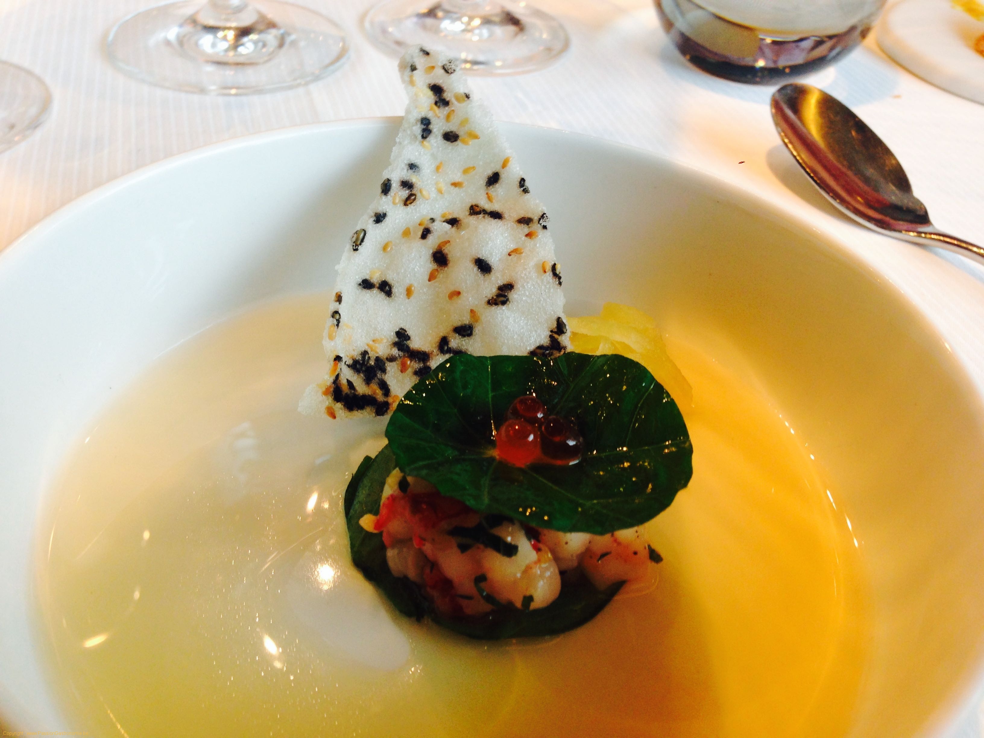 Tartare de Gambero Rosso grillé en nénuphar de capucine et bouillon dashi de jasmin.