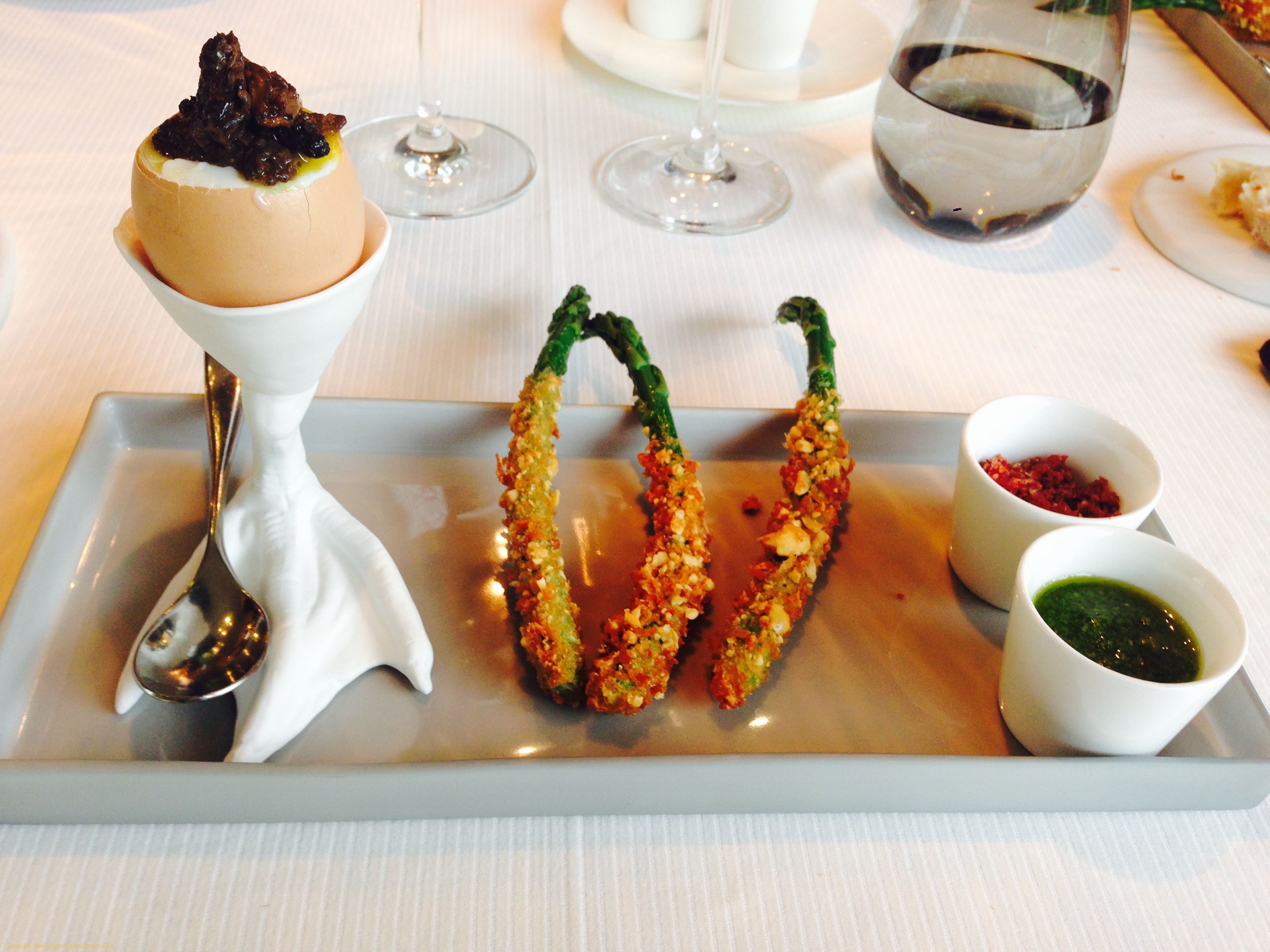 Les fillettes de Jurbise panées aux noisettes, œuf coque aux morilles et, pour condimenter les mouillettes, de la poudre de Jambon Ibérique ou du pesto d’oseille.