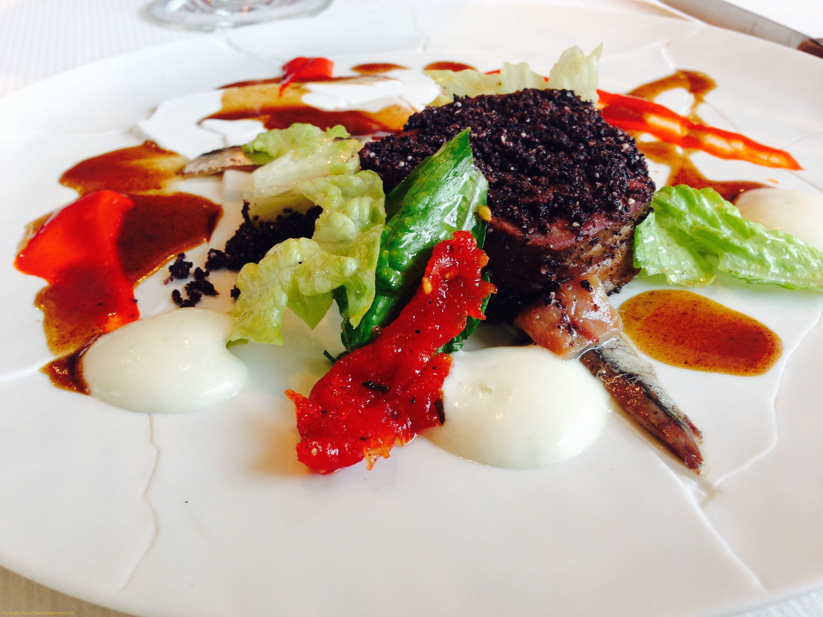 L’improvisation du chef (un plat qui n’est pas encore à la carte) : Black Angus en crumble d’olives noires, coulis de pequillos, espuma de parmesan, anchois et salade.