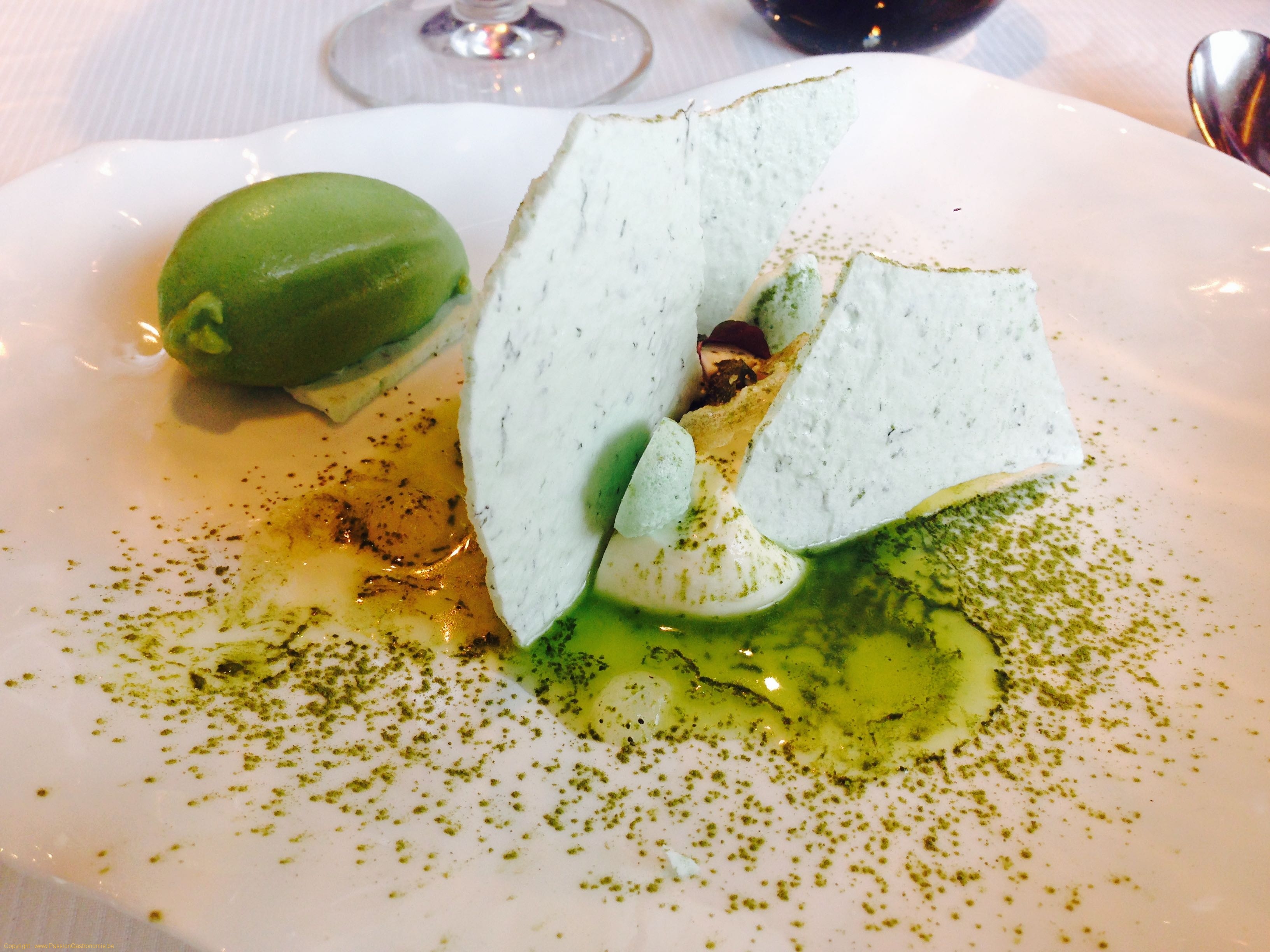 Le fromage blanc de Beersel préparé en fontaineblau, meringue d’aneth et de cerfeuil, sorbet oseille et poivre, concombre, céleri et citron vert. Peut-être bien le meilleur dessert que j’aie jamais mangé tellement j’ai adoré sa fraîcheur et les notes végétales. Un équilibre subtil et léger qui permet de terminer le repas sereinement.