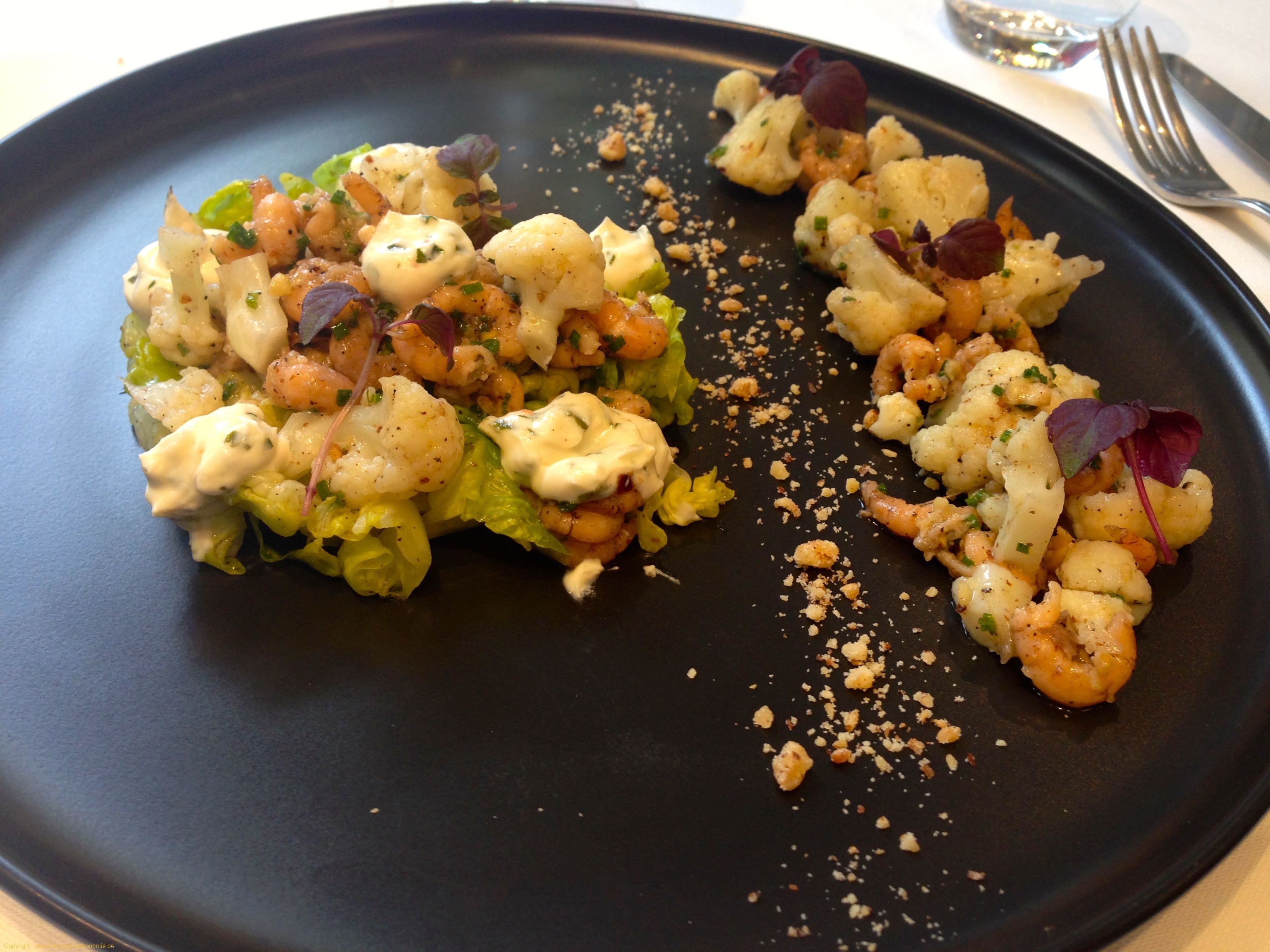 Crevettes grises, fromage blanc de Beersel, chou-fleur, noisettes et ciboulette