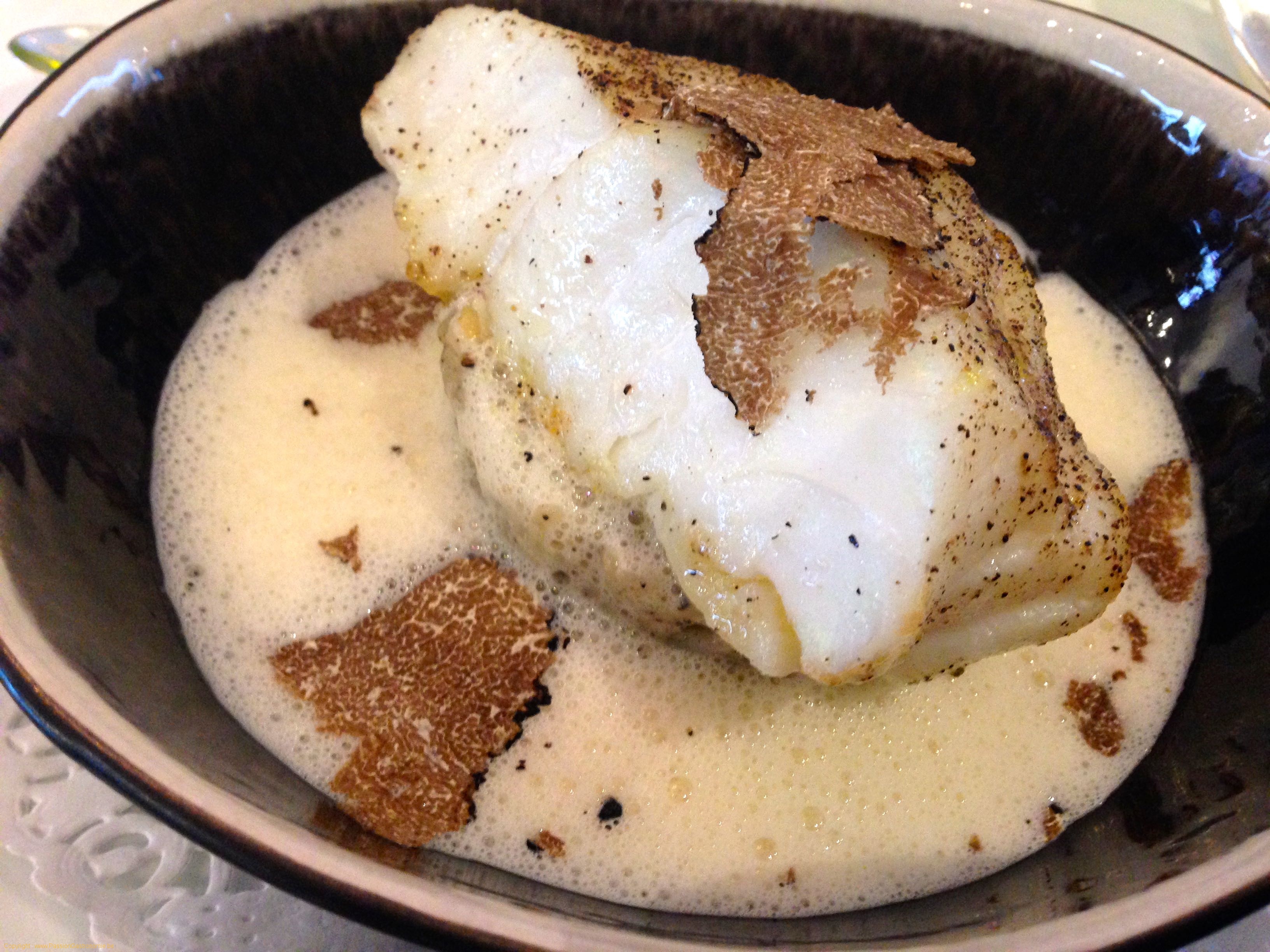 Joues de cochon braisées au cidre, croustillants de camembert et ciboulettePlat : Râpures de truffe d’été, cœur de cabillaud royal, risotto du rabassier, parmesan émulsionné