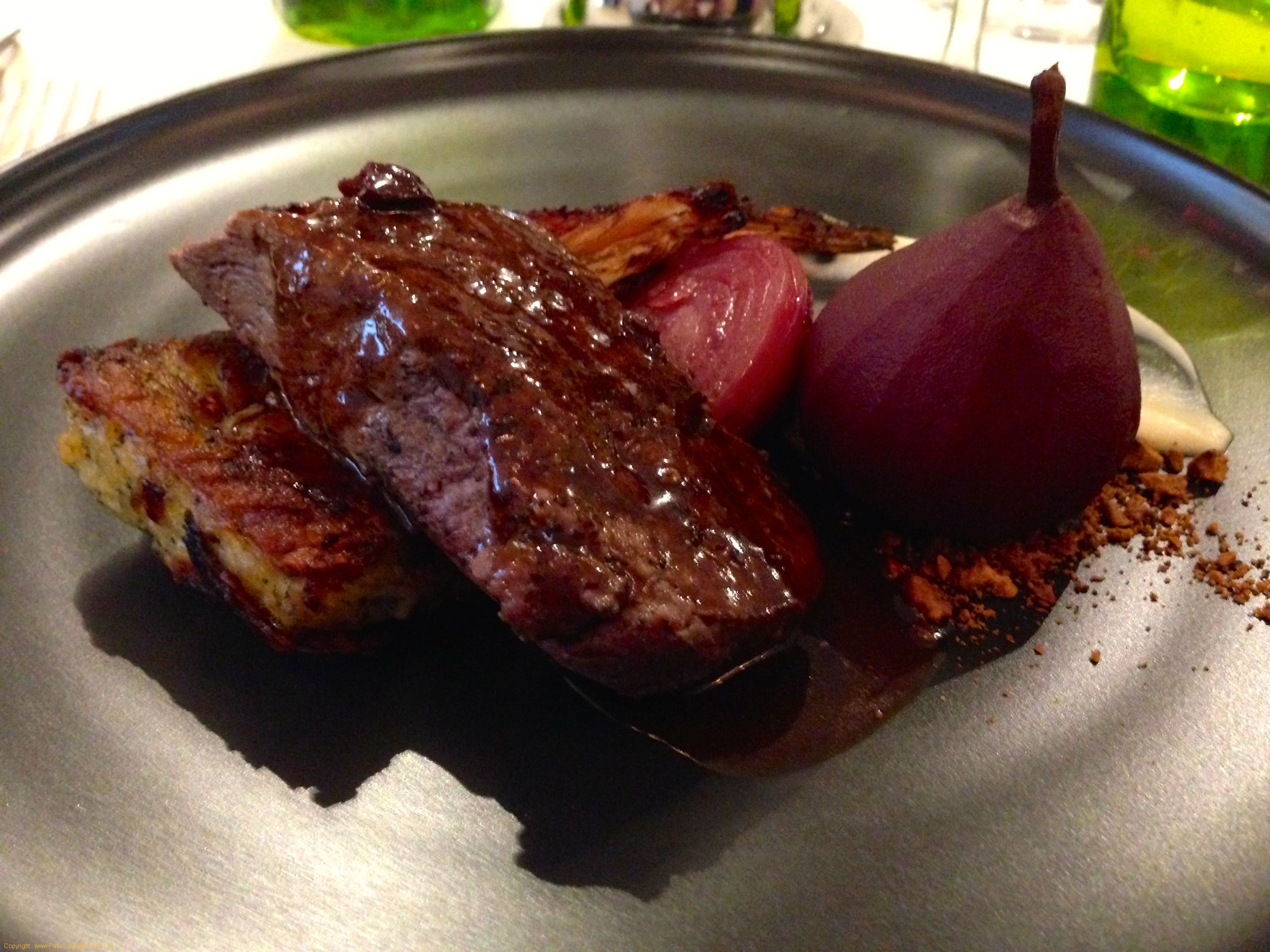Plat : Filet pur de chevreuil , fenouil brulé au vinaigre , oignon rouge confit , poire au vin , figue , céleri , galette de pomme de terre à la truffe