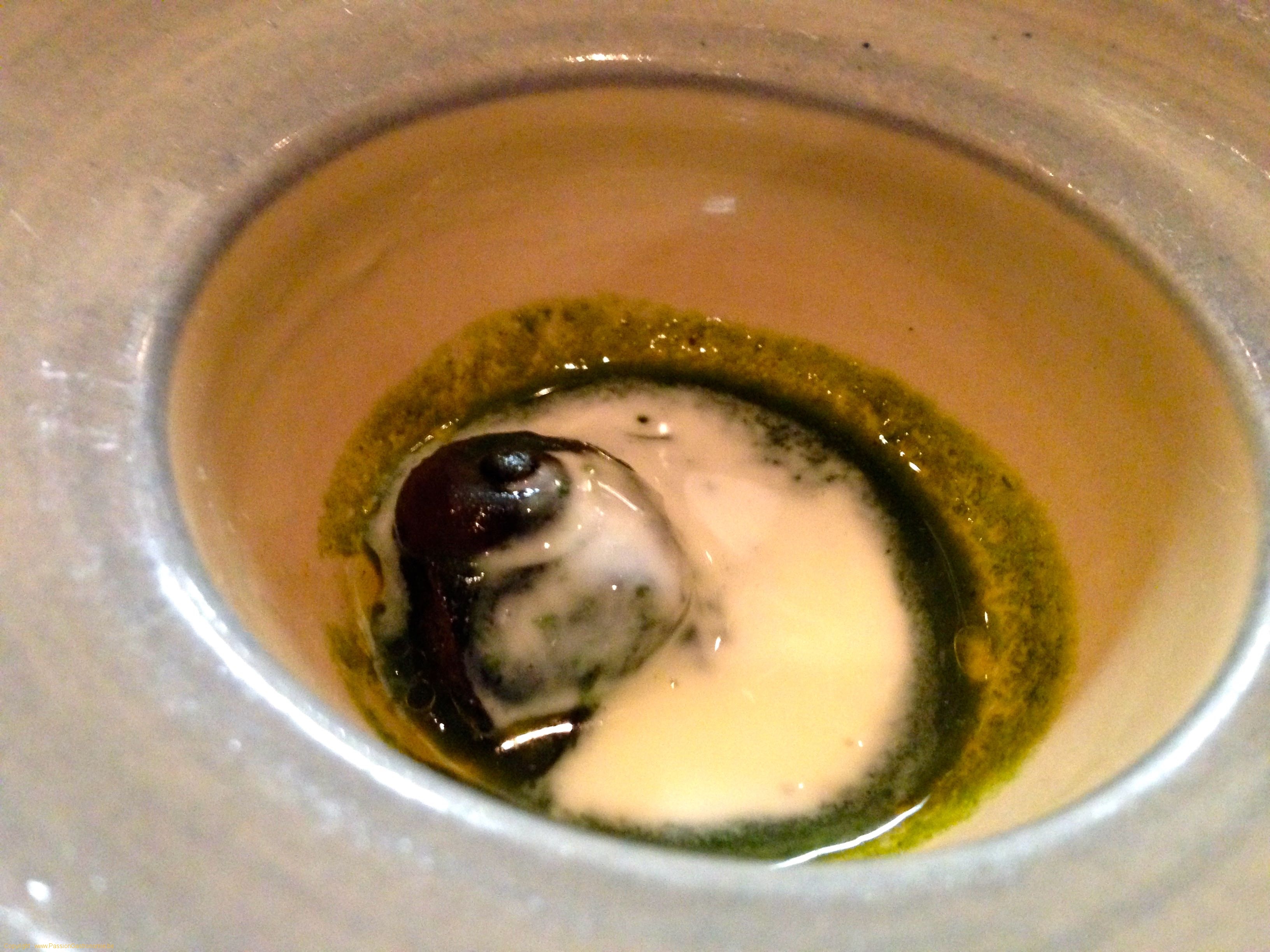 Mise en bouche : Petit gris, jus végétal et crème d’ail