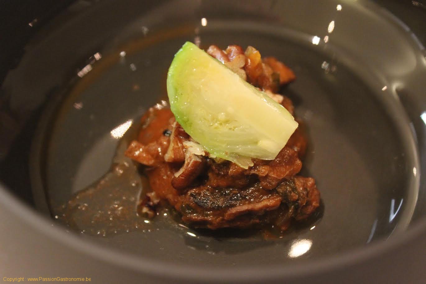Mise en bouche : civet de chevreuil, noix et chou de Bruxelles