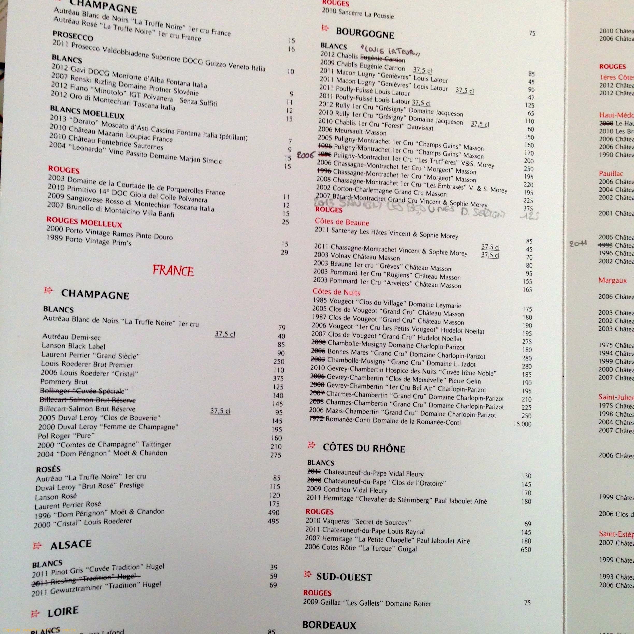 Une carte de vins où on écrit dessus n’est pas digne d’un restaurant de ce niveau. Si on change de millésime, cuvée, voir domaine, on refait la carte en entière, ou au moins la page si possible. Règle de base pour moi. Si je faisais ça comme sommelier dans les restaurants où je travaillais…non, juste non.