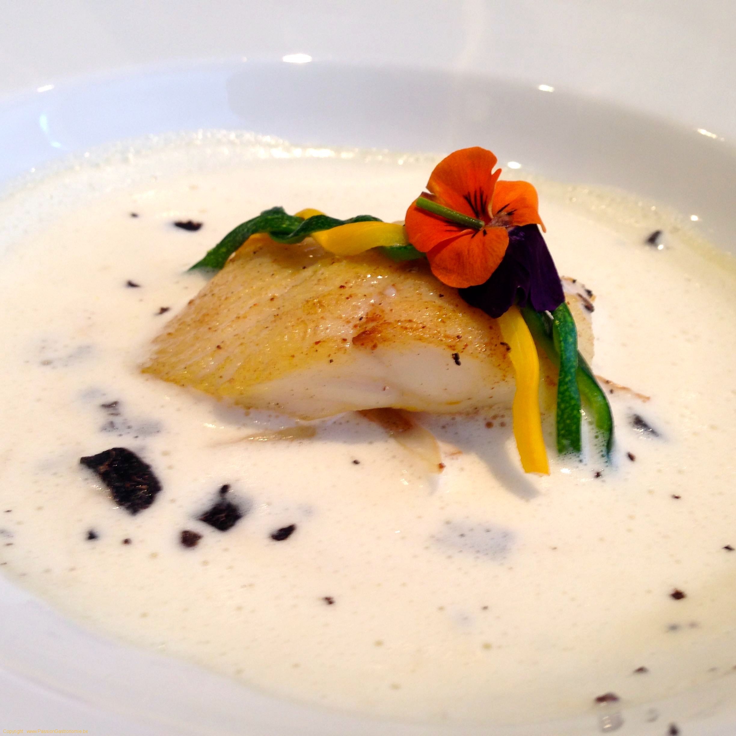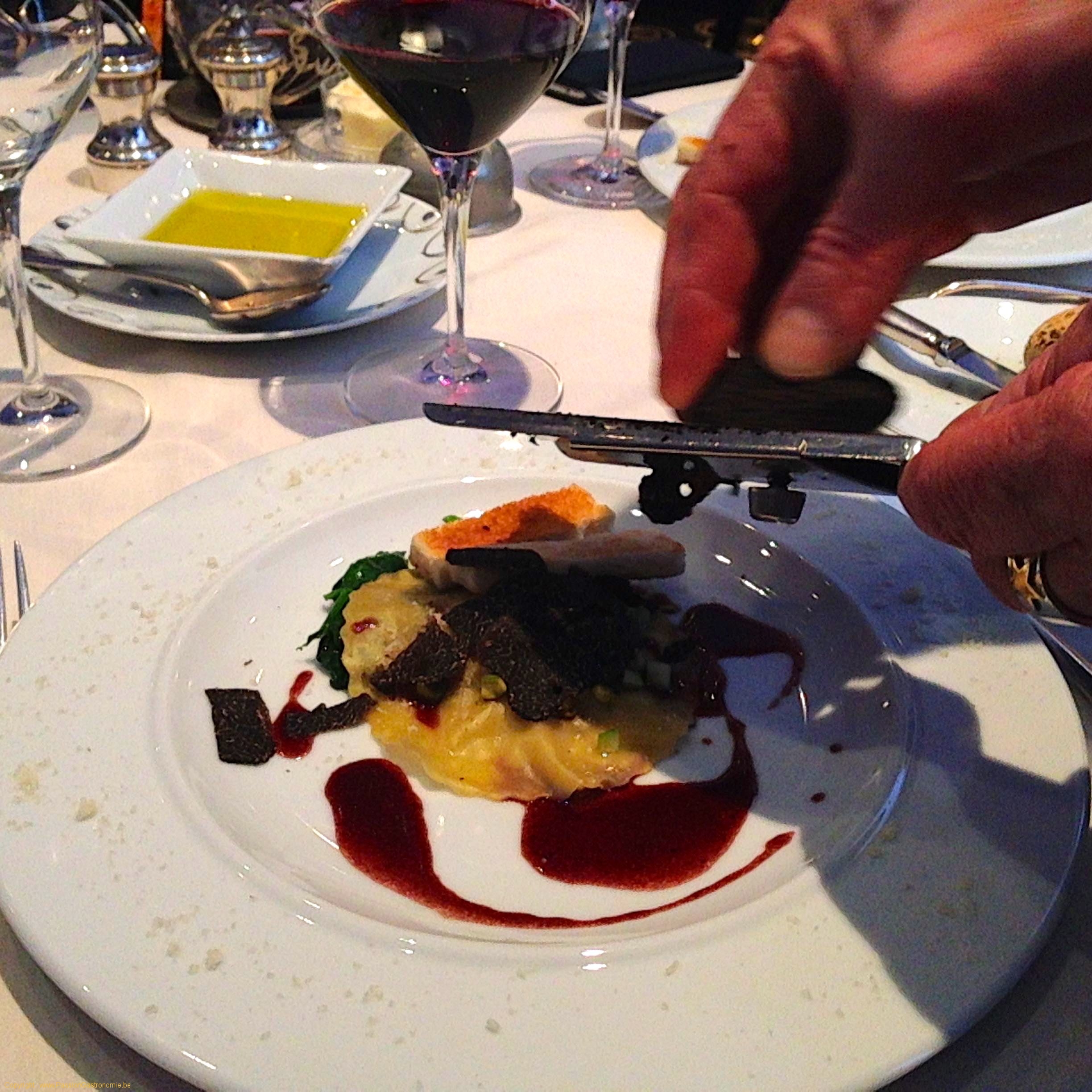 Pour le vin, je me suis un peu senti « arnaqué » par le sommelier de la Truffe Noire. La table avait demandé au sommelier le forfait 4 vins pour 45 euros. Le sommelier a alors demandé ce qu’on aimait comme vin : léger, corsé,…. et puis est arrivé avec sa bouteille. Et ce fût le seul vin qu’il nous ait servi. Il a donc volontairement préféré ne pas nous servir les 4 vins différents (ce qu’on avait demandé et ce qui était indiqué sur le menu) et au lieu de cela « pousser » une bouteille de son choix. En conséquence : des accords ratés sur certains plats  : un vin rouge tannique avec un turbotin à la crème, ca ne passe pas.