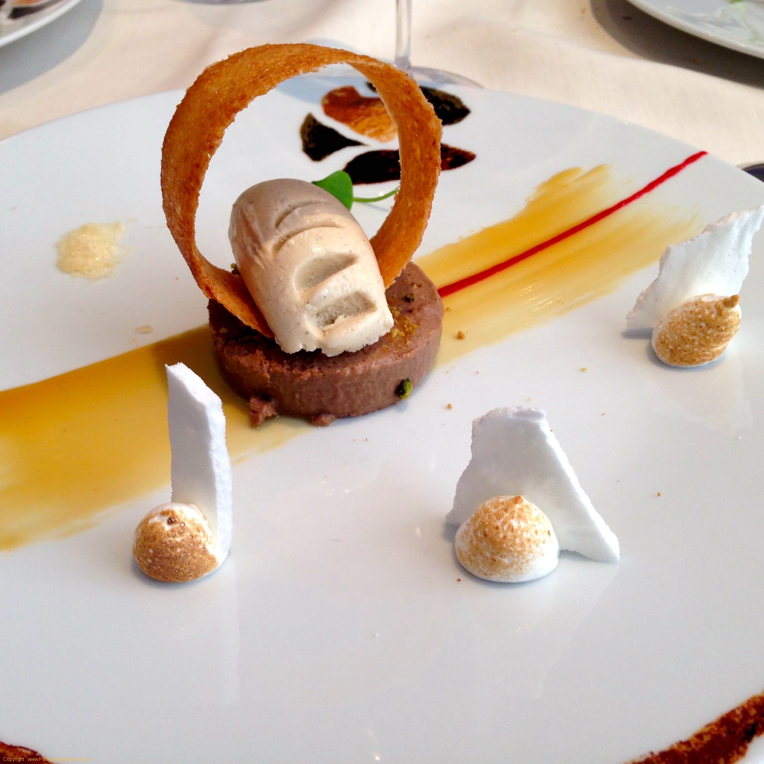 Flan au cacao 66% de Colombie, caramel à la fleur de sel de Guérande, glace à la truffe. Glace à la truffe : voilà quelque chose que je n’avais jamais gouté. Et bien à mon avis, ça ne sera pas pour cette fois ci. Car j’ai bien sûr voulu le goûter seul et je n’ai senti que …la vanille. S’il y a de la truffe, il y en a si peu qu’on ne la sent pas. Pour le reste, la photo en dit long : pas grand chose d’intéressant
