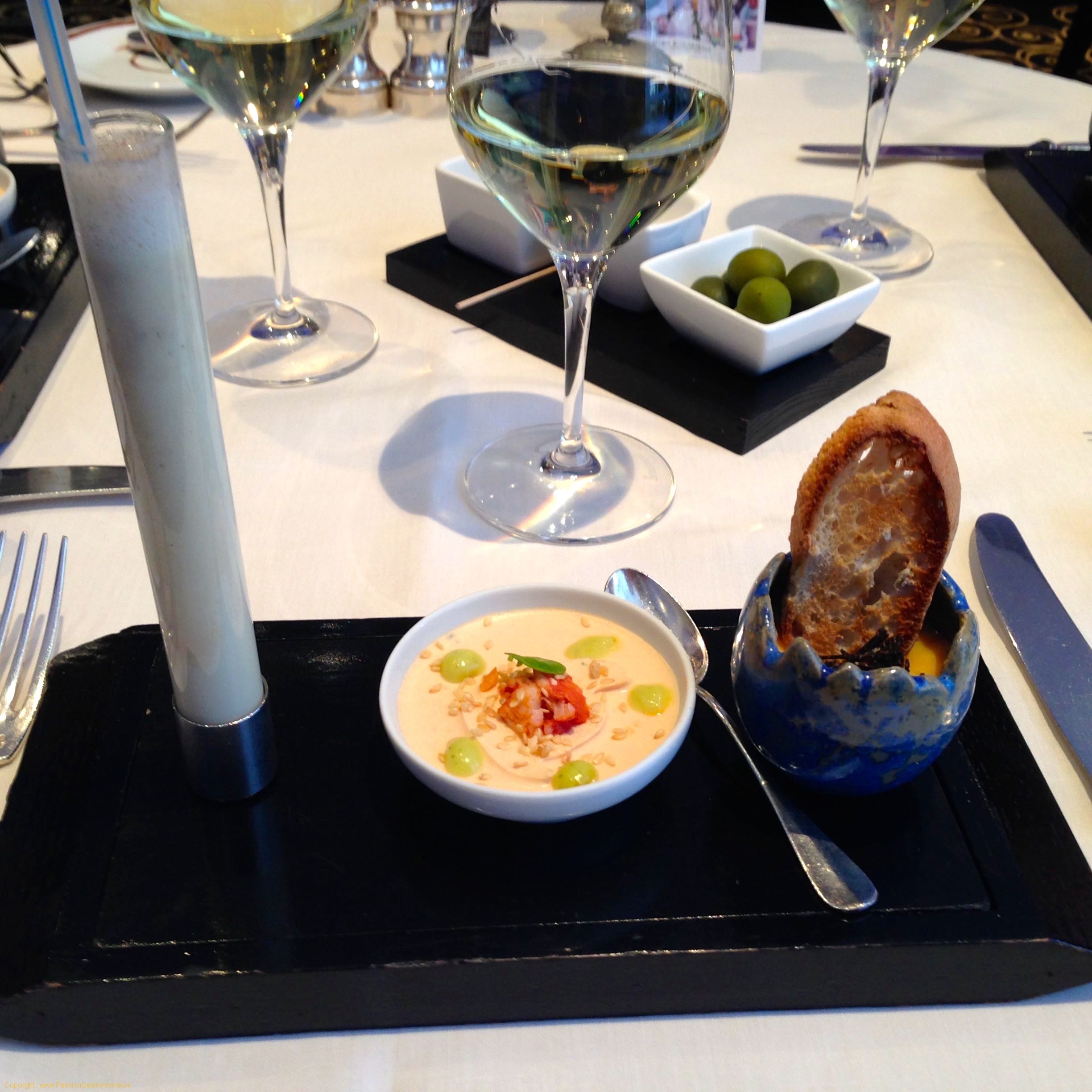 Pour le vin, je me suis un peu senti « arnaqué » par le sommelier de la Truffe Noire. La table avait demandé au sommelier le forfait 4 vins pour 45 euros. Le sommelier a alors demandé ce qu’on aimait comme vin : léger, corsé,…. et puis est arrivé avec sa bouteille. Et ce fût le seul vin qu’il nous ait servi. Il a donc volontairement préféré ne pas nous servir les 4 vins différents (ce qu’on avait demandé et ce qui était indiqué sur le menu) et au lieu de cela « pousser » une bouteille de son choix. En conséquence : des accords ratés sur certains plats : un vin rouge tannique avec un turbotin à la crème, ca ne passe pas.