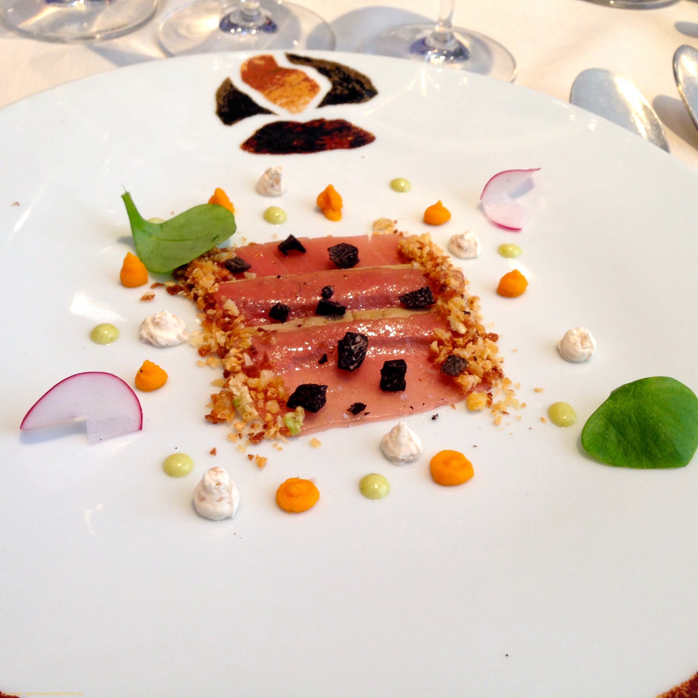 Carpaccio de thon rouge et foie gras, crumble de céleri, roseval et truffe, marqueterie de noisette, butternut et menthe. Un très beau plat froid plein de sensibilité et de finesse avec de beaux produits tranchés extra-fins et une belle harmonie entre le thon et le foie gras