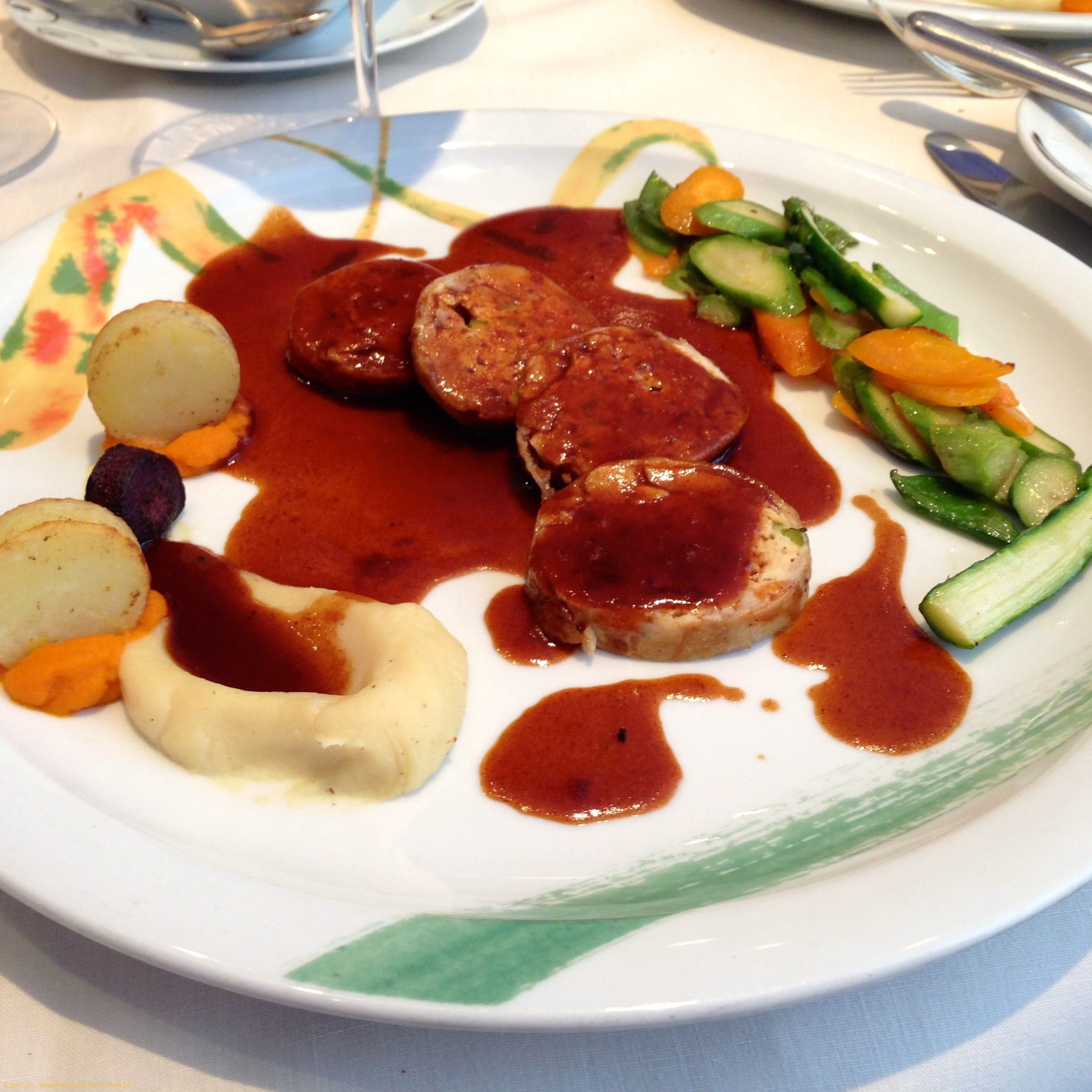 Jambonette de volaille de Racan, truffée aux pistaches de Bronte, sauce périgourdine. Au moment du service, le maître des lieux déclare d’emblée que le plat est parfait mais que si on le souhaite, il peut râper des truffes pour 10 euros par assiette. Puisque le plat est soi-disant parfait, je fais donc confiance au chef. Et j’ai bien fait : le plat est tellement décevant que j’ai économisé 10 euros : volaille sèche, assiette tellement chaude que la sauce se fige, légumes sans intérêt. Ce plat, je ne l’achève même pas.