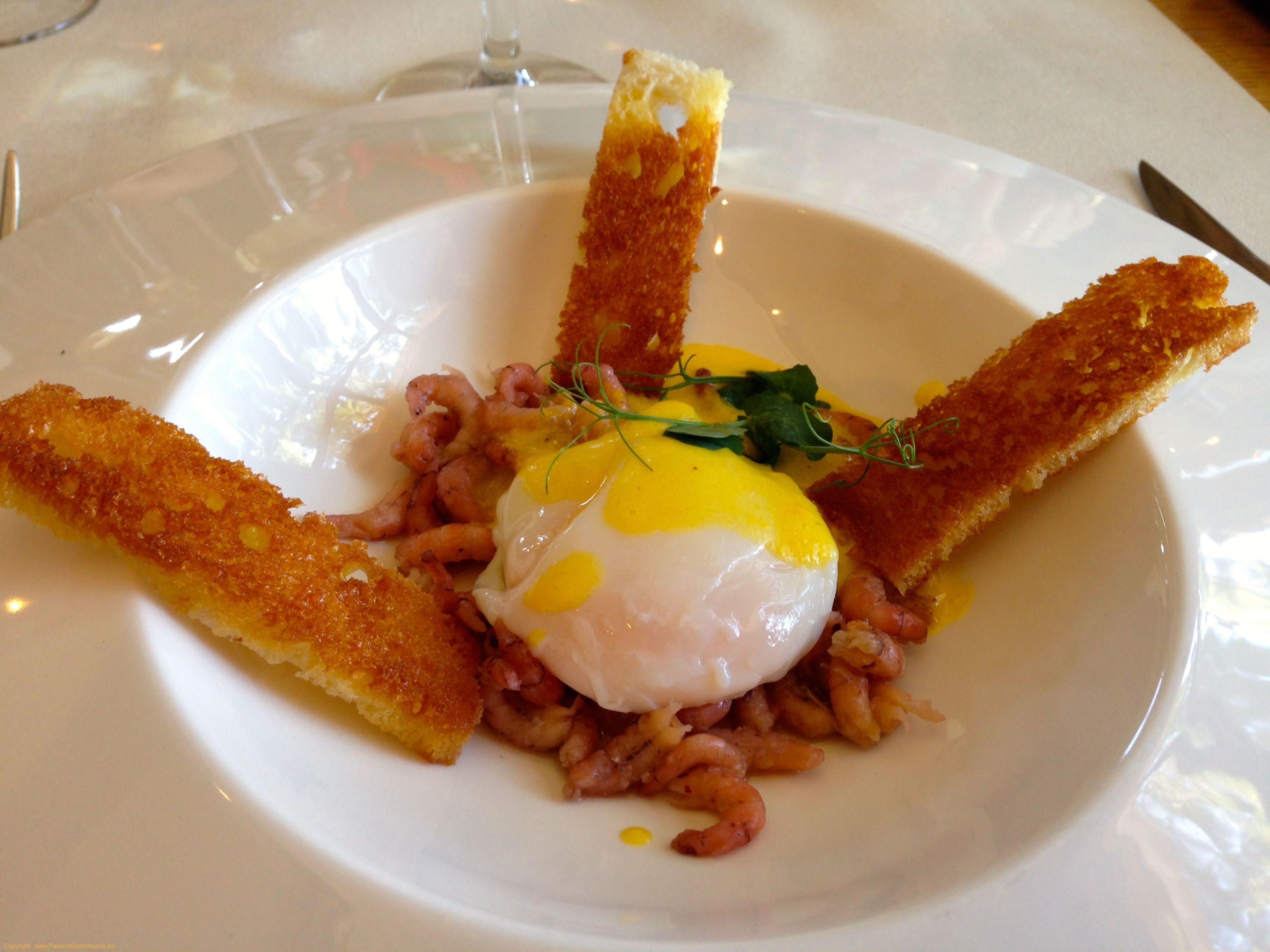L'oeuf cuit à basse température, crevette grise à la mer du Nord, Mousseline à la Trappiste Blanche @La Ferme des 4 Saisons