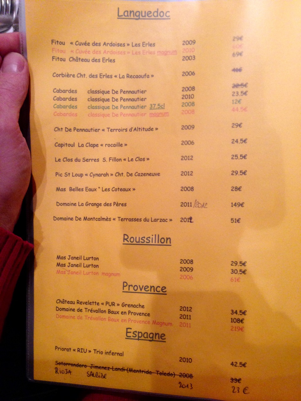 Chez Duche, c’est une carte des vins assez sympa. On trouve un peu de tout (du pichet du patron à La Grange des pères) à des prix dans la moyenne. En guise d’amélioration, je conseillerais toutefois de proposer un peu plus de choix sur les vins blancs. Je comprends aisément le choix intelligent de privilégier les vins rouges vu que le restaurant est plus viande que poisson. Mais deux pages de blancs, c’est très peu.