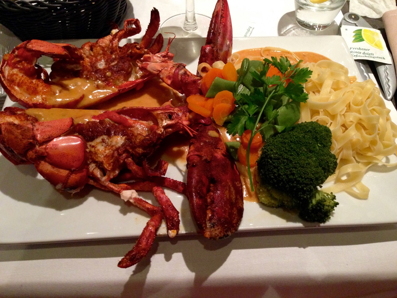 Homard du vivier (600g), fettuccine au jus corsé de crustacés