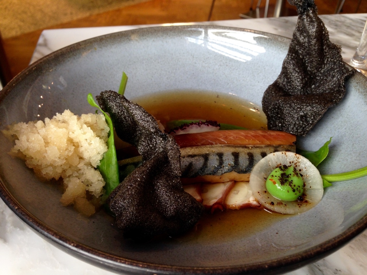 Maquereau en deux préparations : cru au sel et mi cuit, poulpe, oseille, dashi