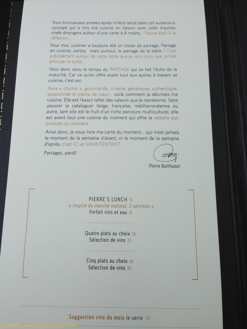 A The Restaurant, le chef Pierre Balthazar passe en fin de service à toutes les tables. Nous en avons donc profité pour échanger nos impressions. C’est un chef à l’écoute et qui ne se vexe pas lorsqu’on aborde des sujets « qui pourraient fâcher ». La discussion fût donc enrichissante.