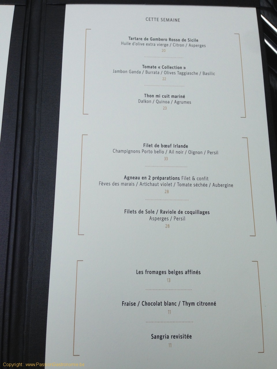 Le chef de The Restaurant avait initié un concept assez sympa. On choisissait tout d’abord son ingrédient (oeuf, boeuf,…) et puis on choisissait un style culinaire dans lequel le cuisiner : belge, thai ou espagnol. Ce concept, que je n’ai pas eu l’occasion de goûter (et c’est bien dommage) n’existe plus. Place à The Restaurant 2.0.