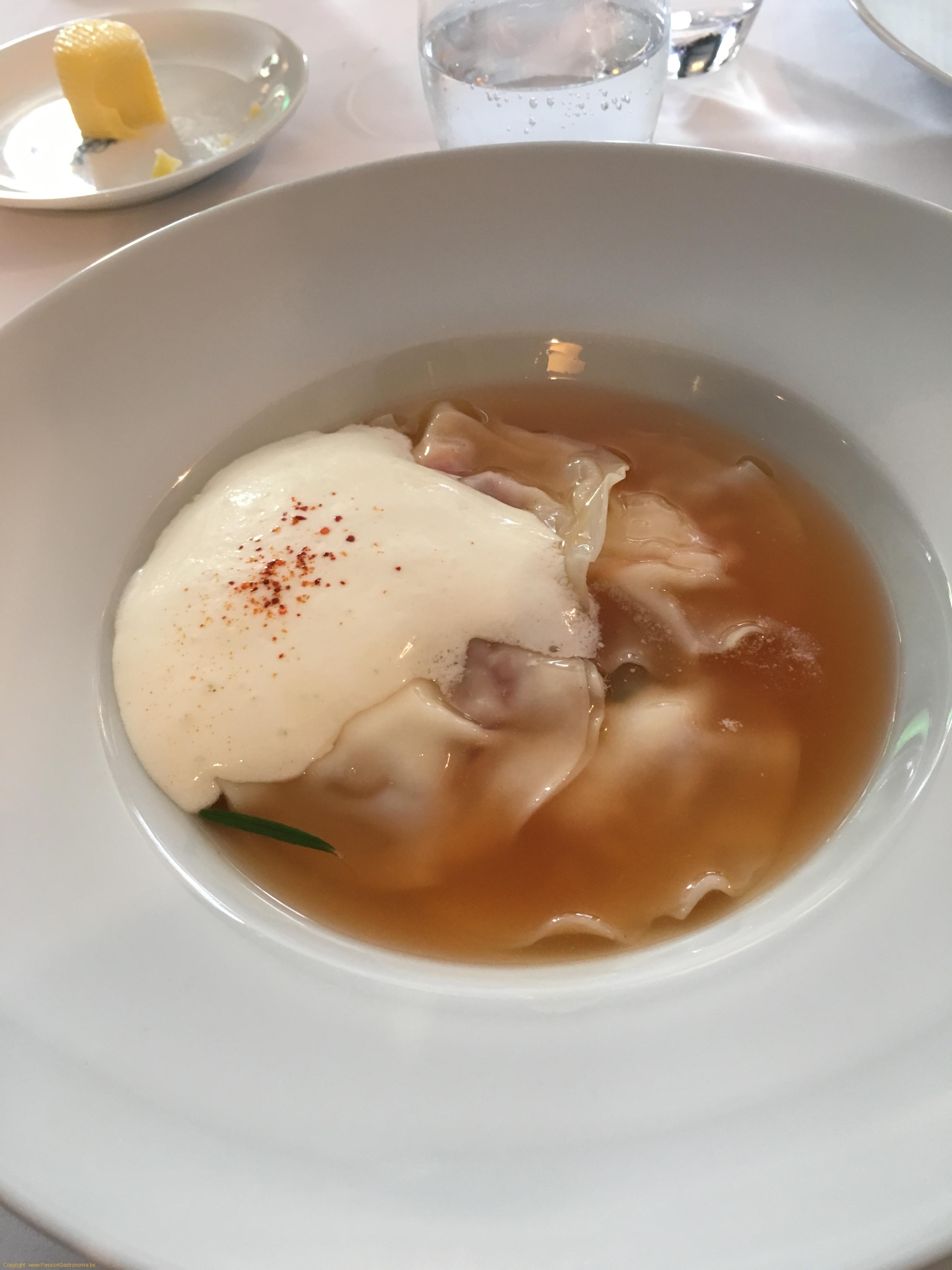 Entrée : Ravioles de homard et buratta bio, consommé de tomates @L'Ecailler du Palais Royal