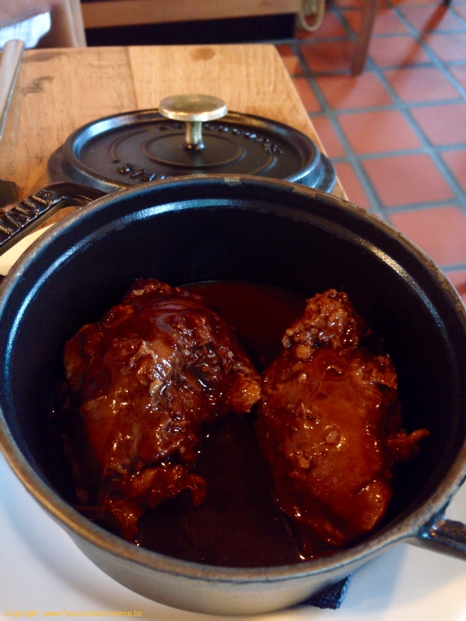 Joues de cochon braisées à la trappiste bleue de Chimay, aligot et carottes cuites au bouillon