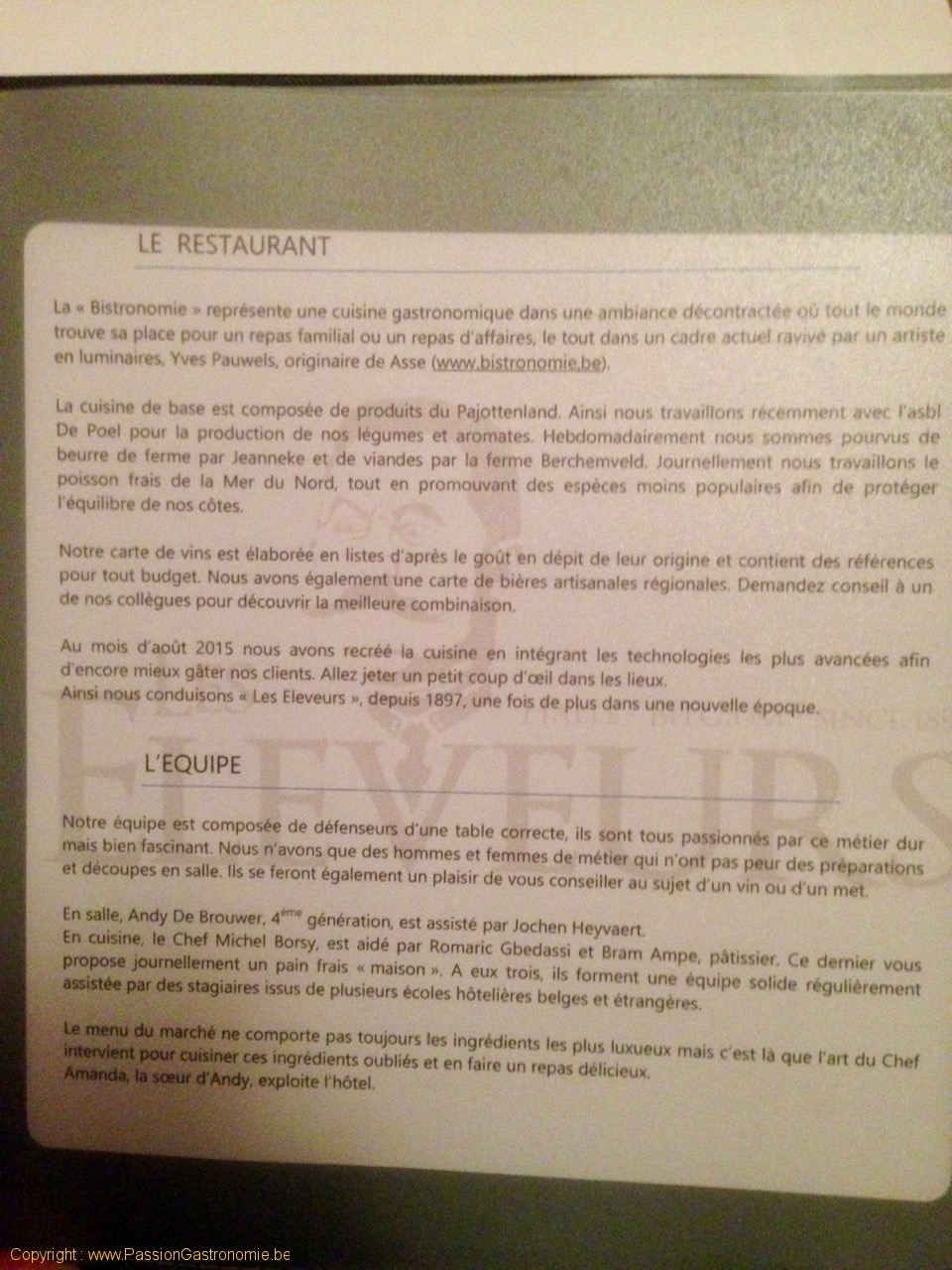Je connais le restaurant Les Eleveurs depuis des années. J’ai donc connu le temps où Sofie Dumont était en cuisine et où le style était gastronomique. Maintenant c’est Michel Borsy qui est dans les cuisines du restaurant Les Eleveurs et c’est donc lui qui cuisine selon un concept différent : celui de la bistronomie.