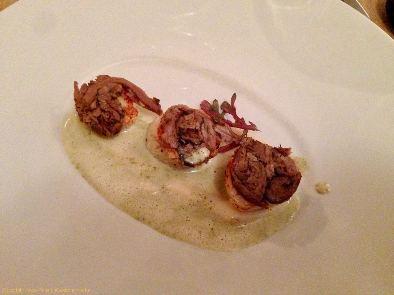 L’association Saint-Jacques et cou de canard s’est avérée un peu en dessous de nos attentes. L’accord des saveurs ne semblait pas harmonieux : les Saint-Jacques auraient sans doute été meilleures juste servies avec le jus d’algues (qui était très bon d’ailleurs).