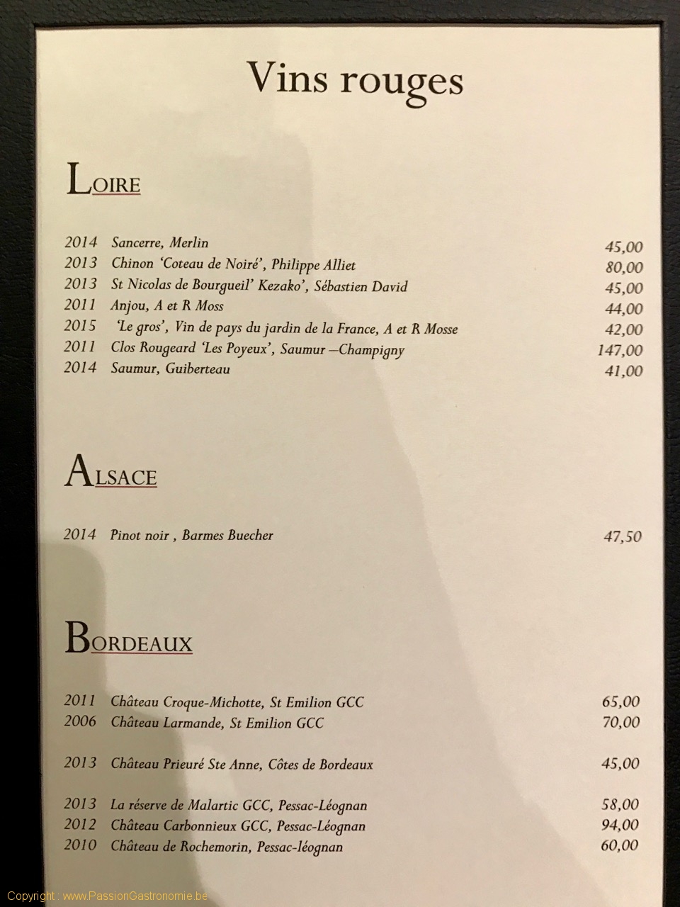Mais, plus sérieusement, il y a vraiment une belle sélection dans cette carte. Notamment ce magnifique « L’Enclos » du domaine de la terrasse d’Elise 2013 (en arrière plan de la photo). Un ami et grand dégustateur qui a déjà goûté les plus grands (DRC, Roumier, Rousseau, Jayer,…) m’a dit une fois : « Dans les tout grands vins rouges, c’est-à-dire dans les vins mythiques, on retrouve toujours des arômes floraux à un moment donné ». Et, tout proportion gardée (car on parle ici d’une bouteille à prix accessible à 65 euros à la carte), ce vin de Xavier Braujou était d’une finesse et d’une légèreté remarquables. Les arômes floraux étaient ici matérialisés par la rose. Dommage que le fournisseur, les vins Poulet, aie tout vendu car j’en aurais pris quelques bouteilles.