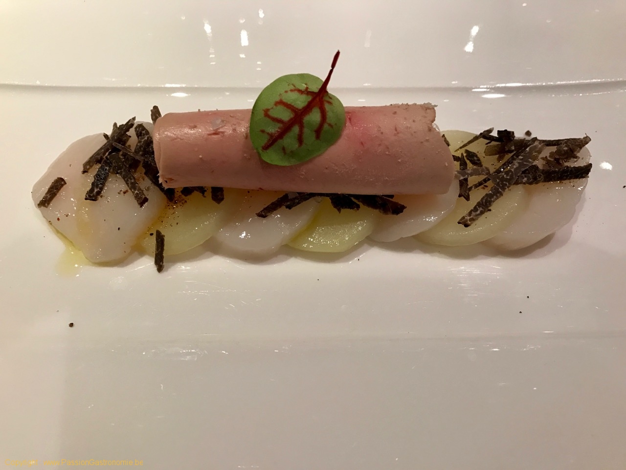 Eventail de coquilles Saint-Jacques, pomme de terre ratte, copeaux de foie gras, truffe d’hiver