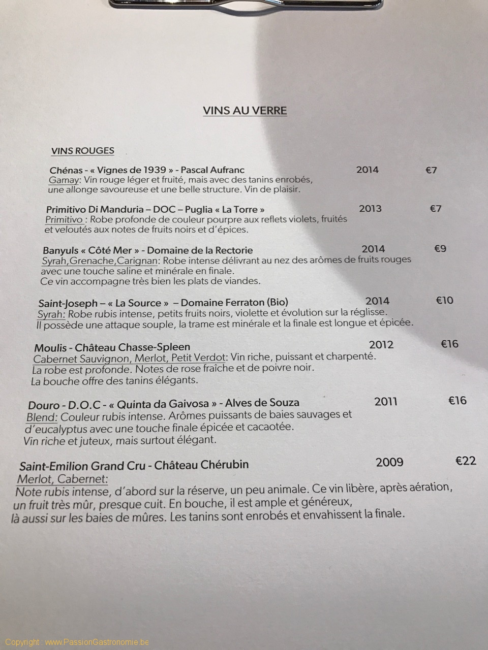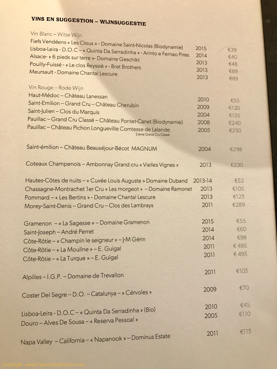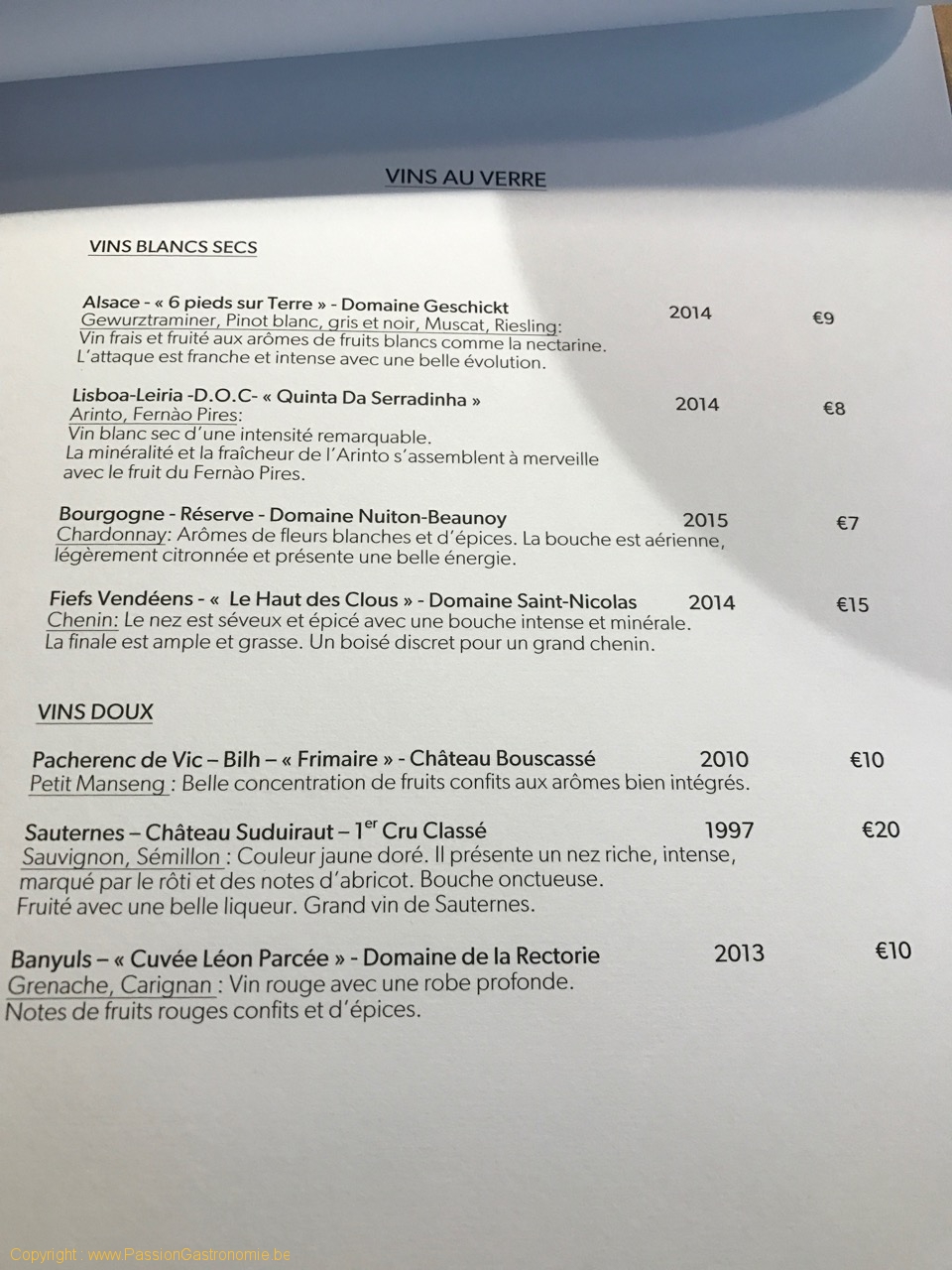 La carte des vins est courte mais bien pensée et en phase avec le niveau du restaurant. Les prix sont corrects. Il y a, en outre, vraiment un grand choix de vins au verre.