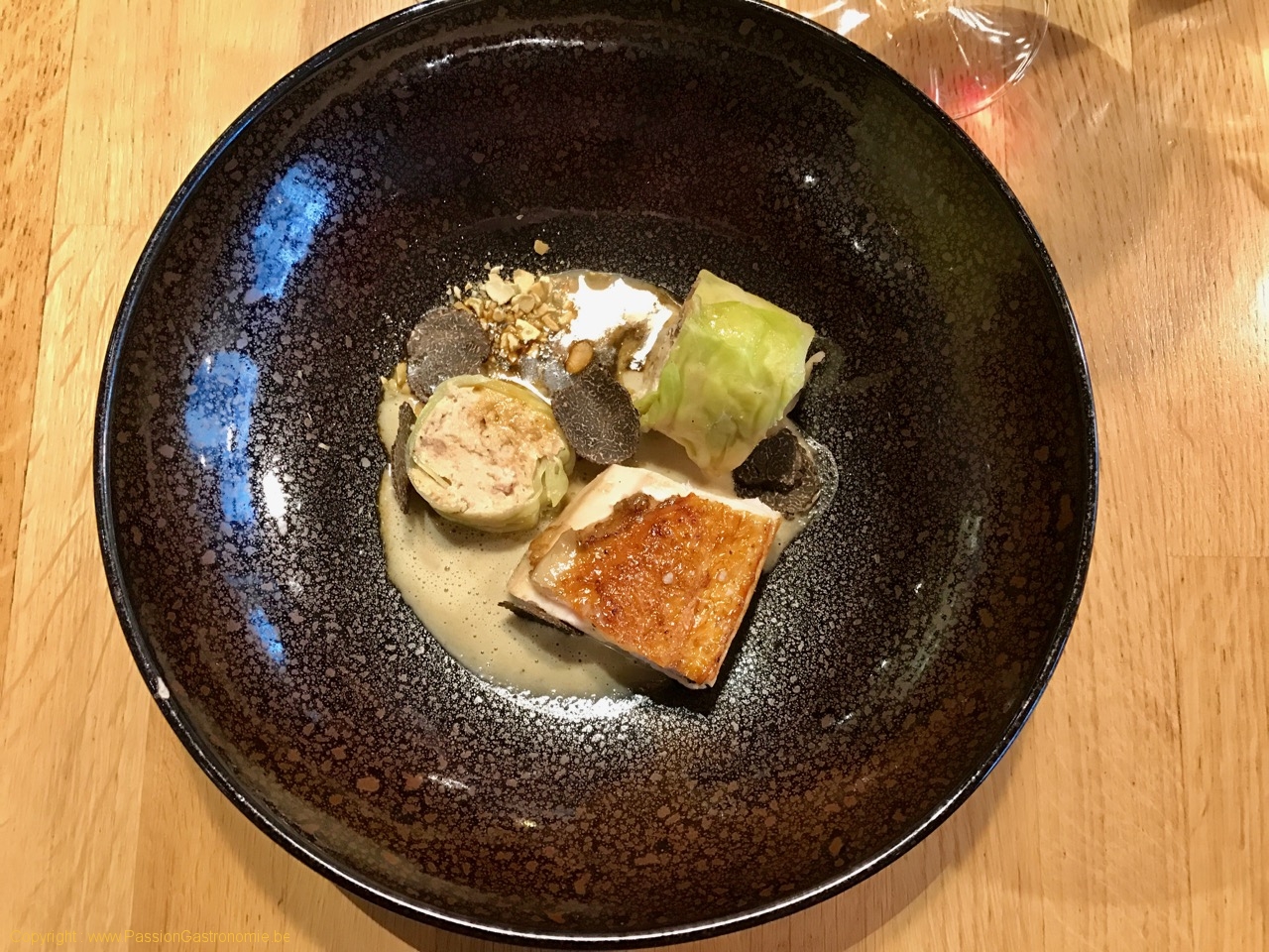 Suprême de poularde de la Cour d'Armoise, mature une semaine et affinés à la vodka, chou farci au foie gras, aux châtaignes et aux truffes @Colonel