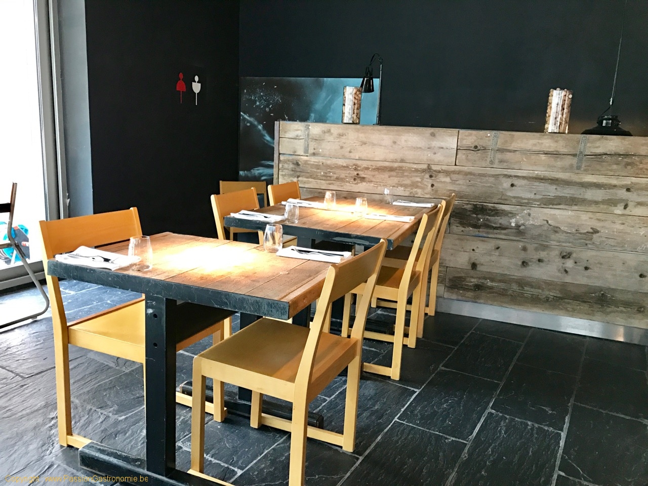 Le cadre du restaurant Humphrey est en cohérence avec les assiettes un peu « brutes » : tables en planche de pin, bétons lissés,…
