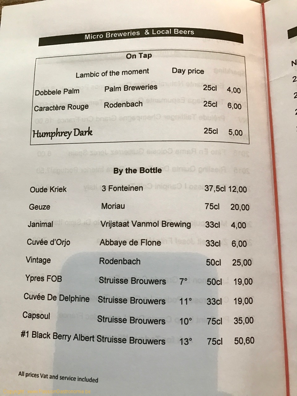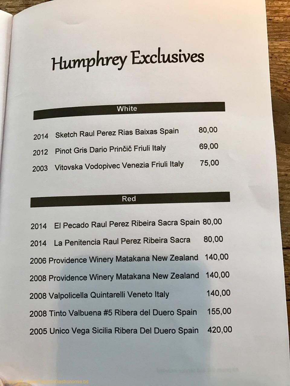 Pour une fois, je me déclare incompétent à émettre un avis sur la carte des vins de Humphrey. Elle est courte (ce qu’on ne peut pas reprocher à un restaurant qui vient d’ouvrir il y a quelques mois) et voyage dans le monde entier avec des choix originaux. C’est même rare de voir à ce point la France sous-représentée.
