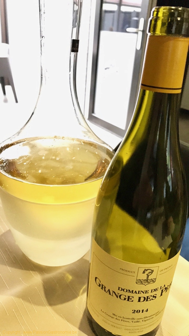 Cette carte est encore en cours d’élaboration mais les prix devraient être hyper doux. On restera loin du classique X3.. Et la sélection contiendra des grands vins difficiles à trouver. Attiré par une photo sur le mur Facebook du restaurant, je n’ai pas résisté et j’ai par conséquent commandé cette bouteille du plus grand vin blanc du Languedoc : La Grange des Pères blanc.