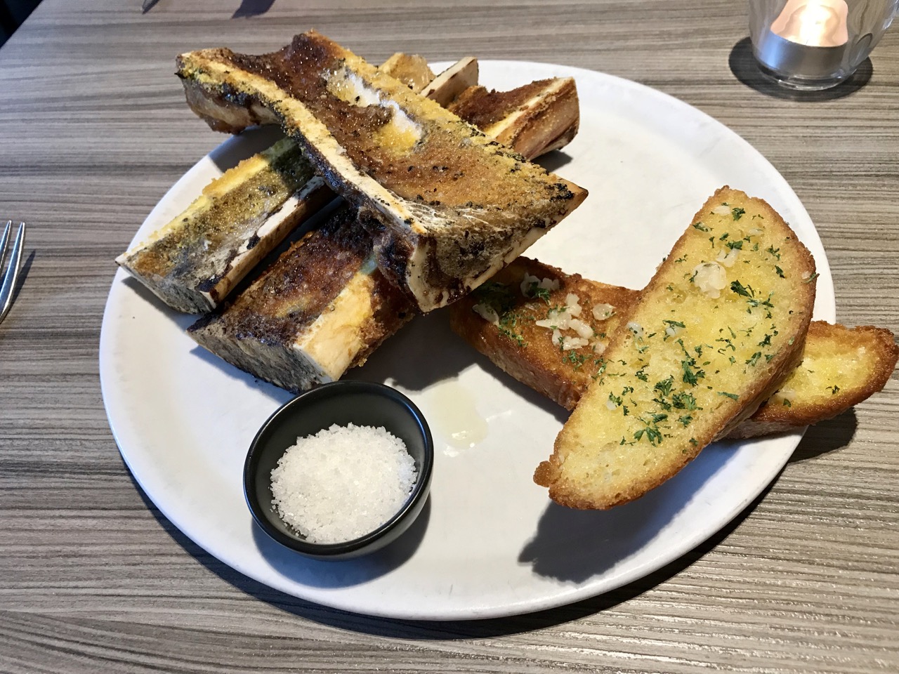 Les os à moelle, servis en entrée, sont parfaits avec une moelle en ébullition et de bons toasts. C’est généreux et très réussi.