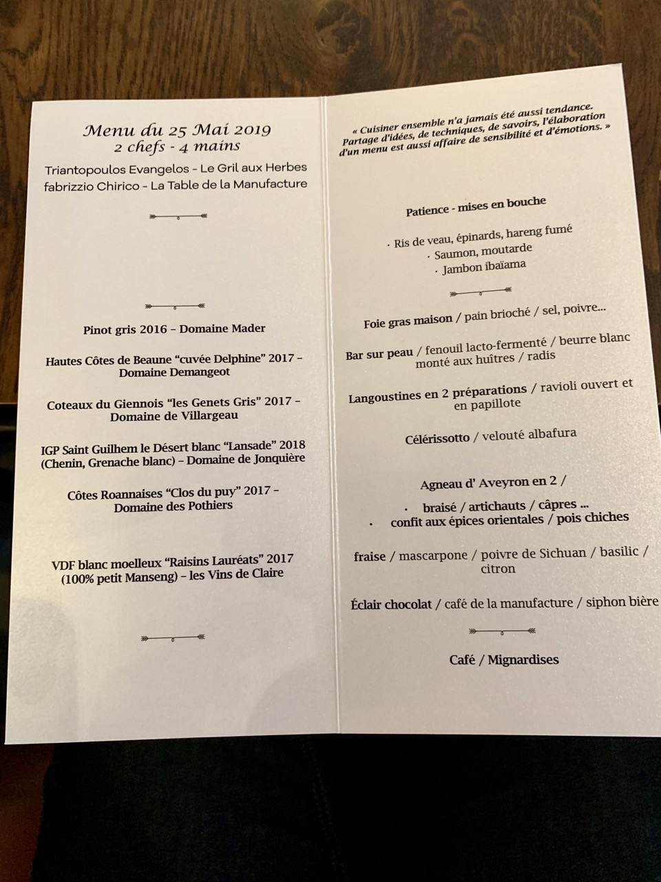 Ce repas était un peu particulier puisque la Table de la Manufacture recevait à domicile Evangelos Triantopoulos du Gril aux herbes d’Evan.