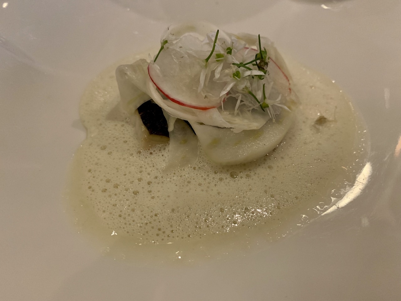 Je dirais même plus : je pense qu’il y a encore eu progrès dans la cuisine. Tout d’abord la cuisine de Fabrizzio s’est simplifiée, ce qui est souvent le témoignage de plus de maturité. L’entrée, le bar sur peau / radis / fenouil lacto-fermenté / beurre blanc aux huîtres émulsionnées, était particulièrement réussie.