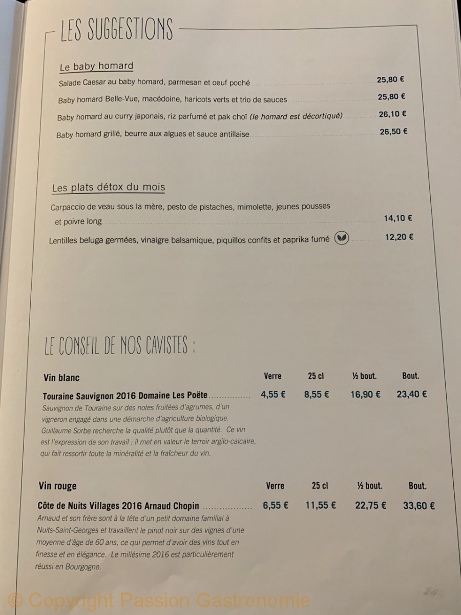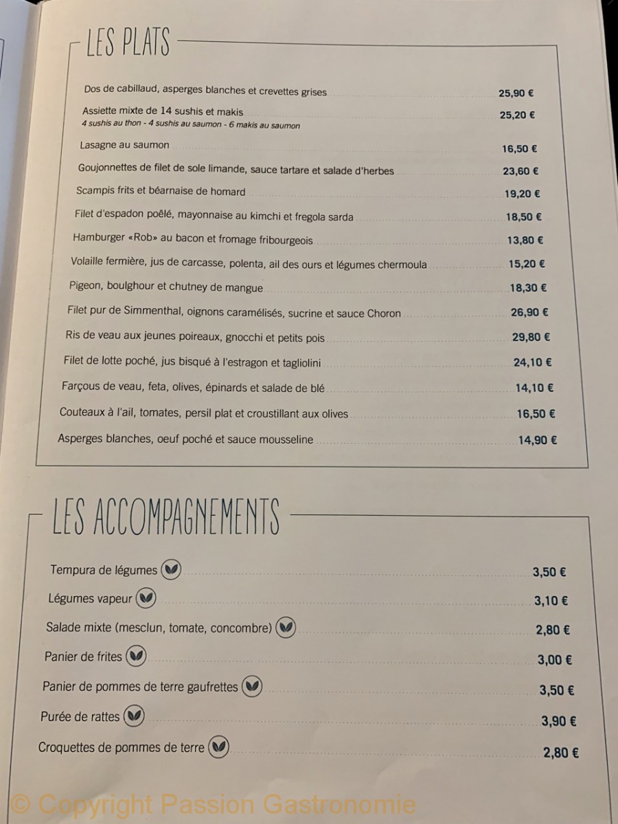Pour réaliser les plats de la carte, le restaurant Rob sélectionne ses produits, tous ses produits chez…..et bien oui : chez Rob bien entendu. C’est la raison pour laquelle j’ai été assez étonné d’apprendre, à notre arrivée à 13h, qu’il n’y avait plus de baby homard en suggestion car tout avait déjà été servi. J’aurais imaginé que quelqu’un aurait pu descendre dans le rayon poissonnerie pour en chercher.