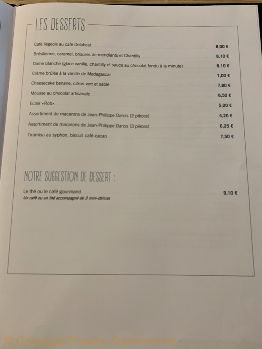 Chez Rob, le chef propose donc des produits de qualité dans des préparations simples mais parfois imprécises dans leur exécution. Heureusement Rob a un atout majeur dans sa manche : Rob-Cellar permet d’avoir accès à la plus belle carte des vins et la moins chère de Bruxelles. Attention toutefois à se montrer plus attentif sur le service de ces belles bouteilles.