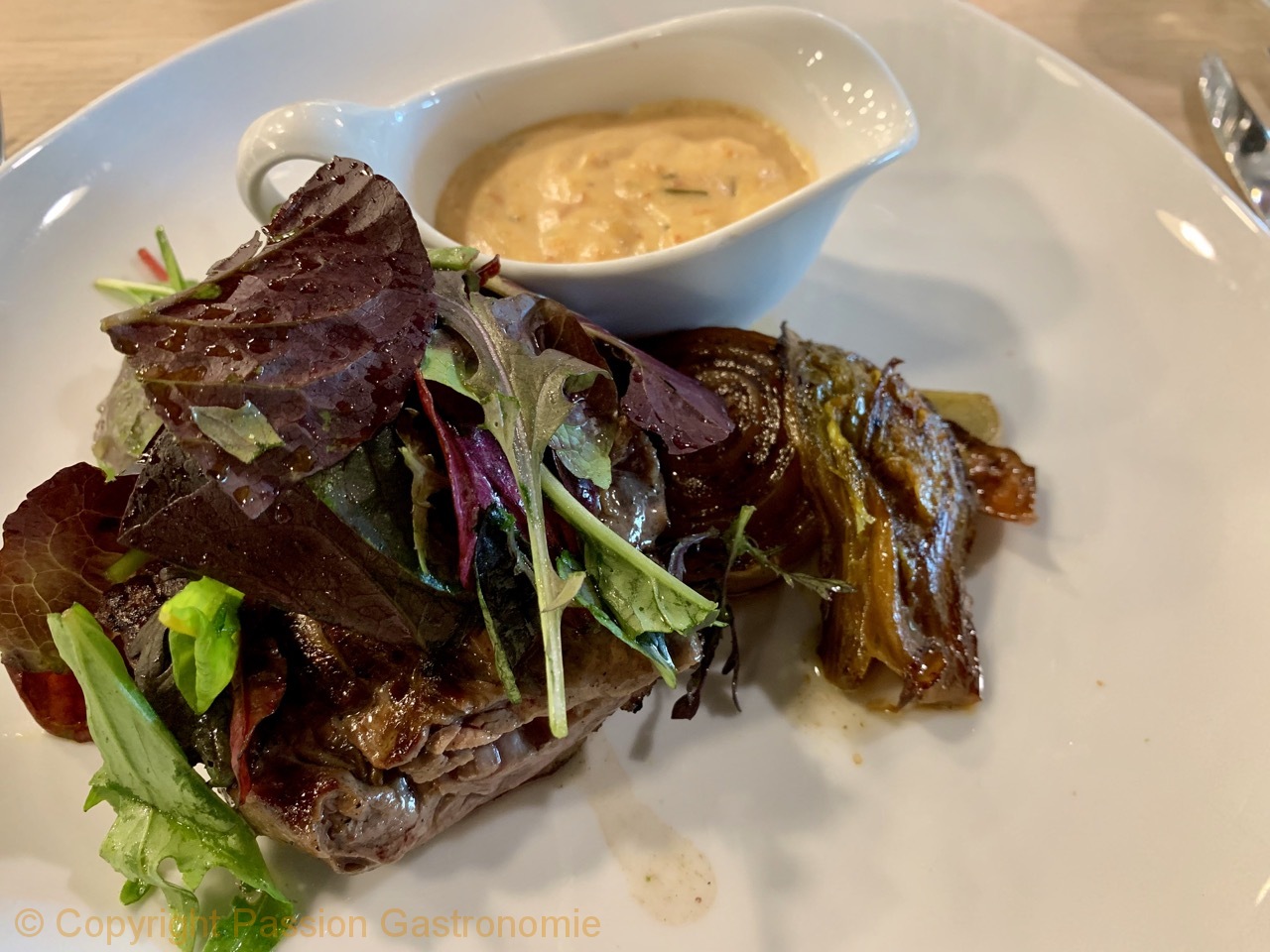 Filet pur de boeuf Simmenthal, oignons caramélisés, sucrine, sauce chroron
