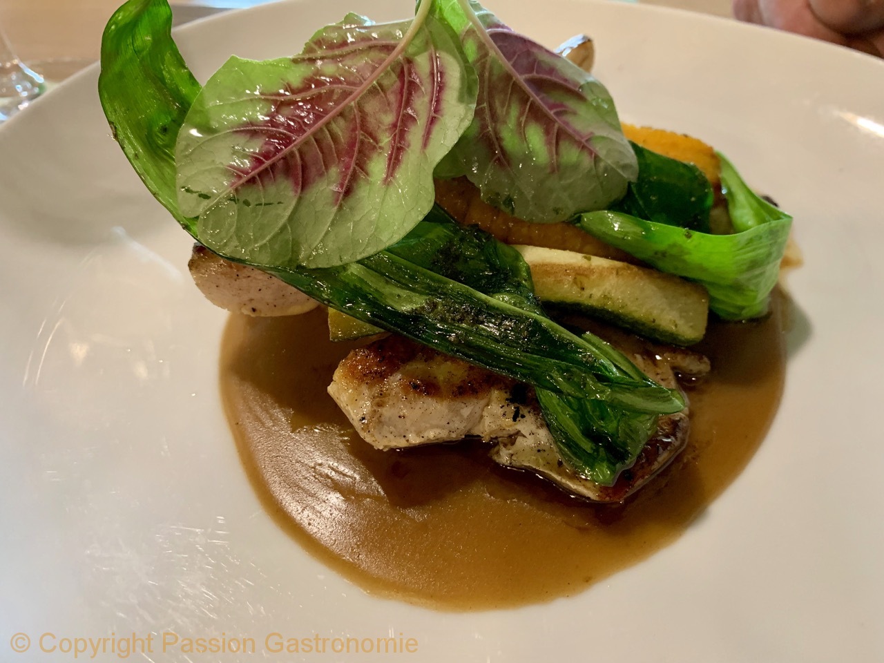Volaille fermière, jus de carcasses, polenta, ail des ours, légumes chermoula