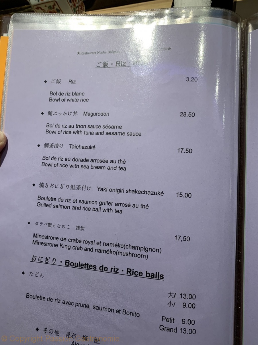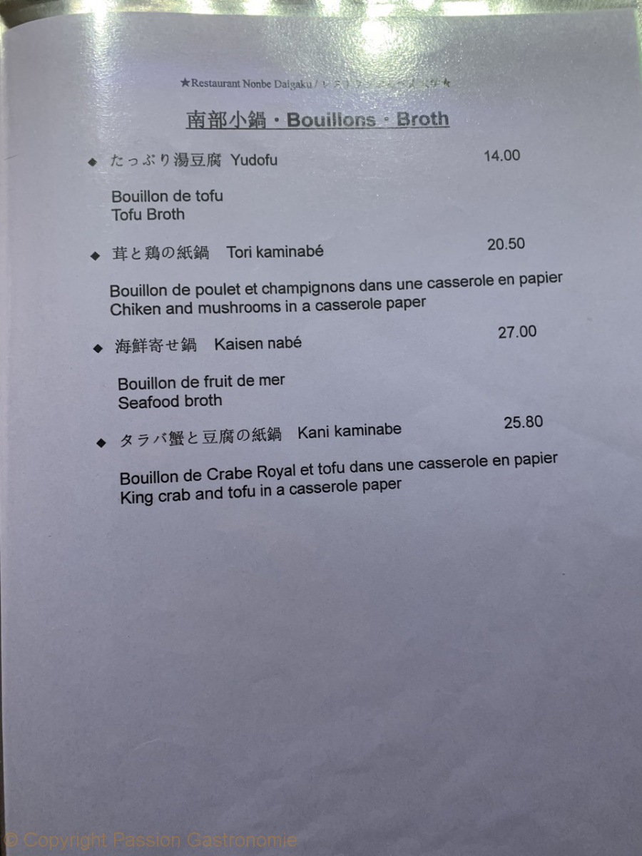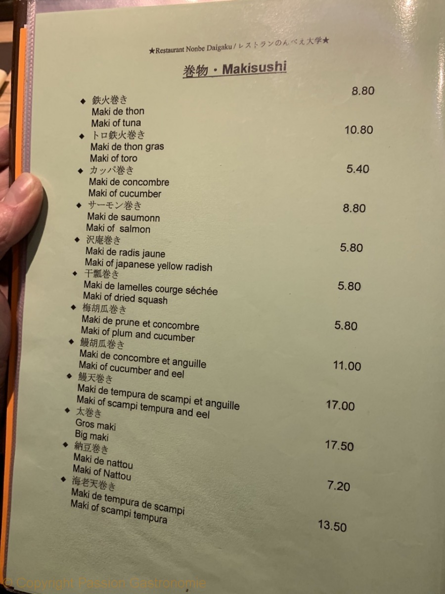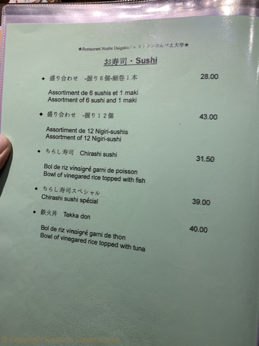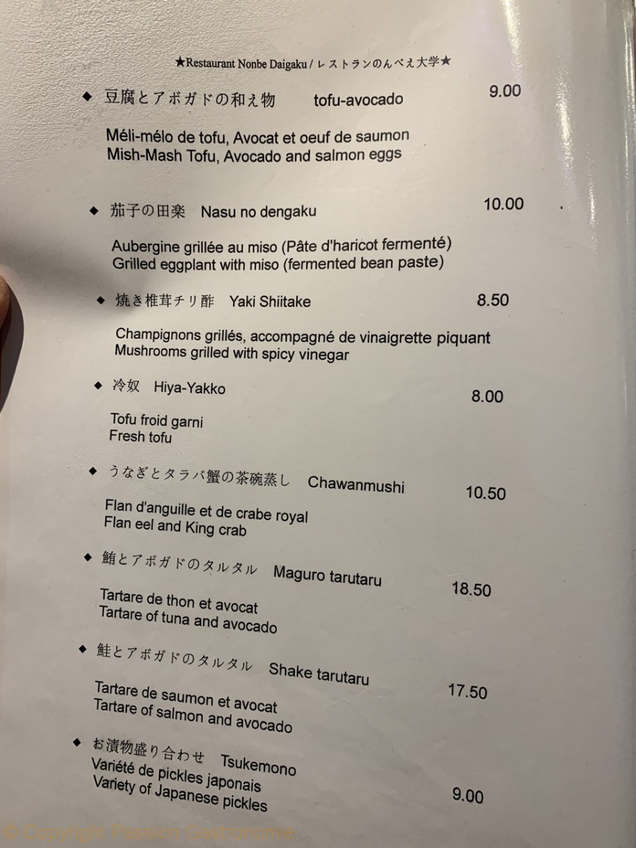 La carte du Nonbe Daigaku est assez longue. Je l’ai photographiée en entier ci-dessous car elle n’était pas sur leur site web. Cette carte changeant peu, n’hésitez pas à la consulter avant votre repas.