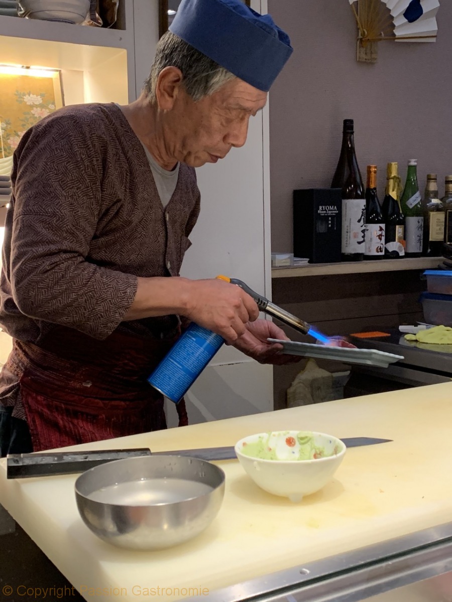 C’est un beau spectacle et cela participe à la magie de sa cuisine : des gestes précis, épurés, maîtrisés. On peut l’y voir se servir de ses ingrédients, trancher les poissons, enlever la peau et façonner les sushis et sashimis à la minute.