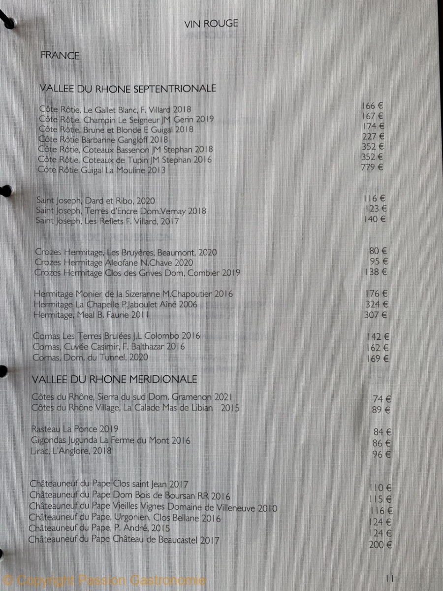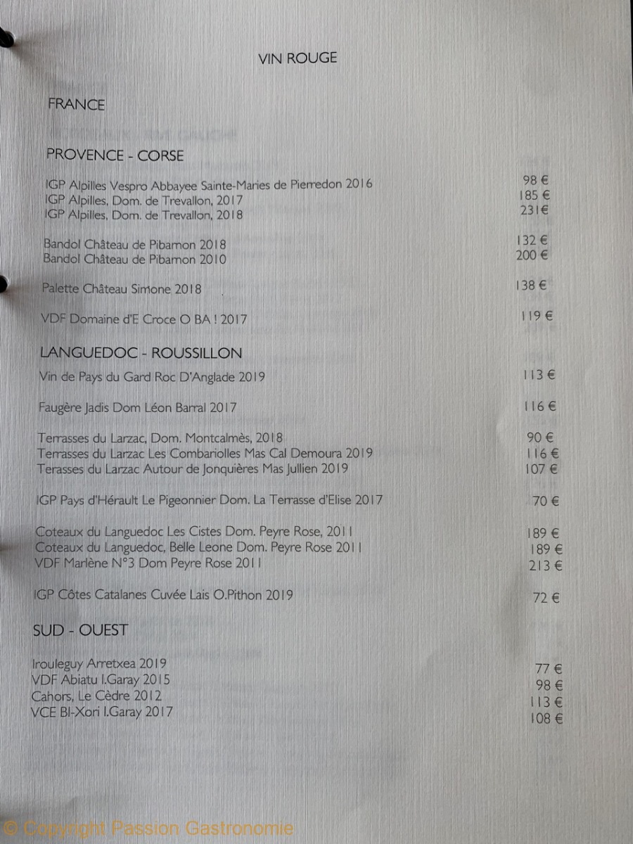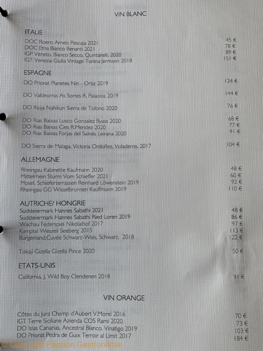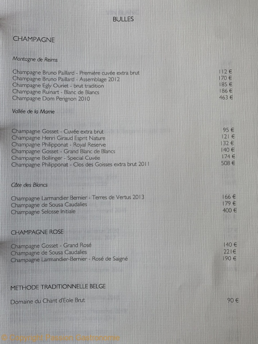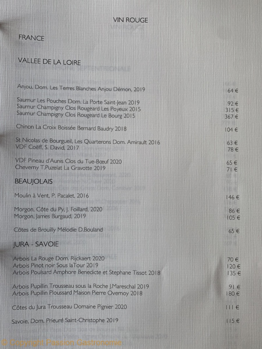 La carte des vins a longtemps été le point faible du restaurant. Mais on y trouve maintenant des références à la hauteur d’un chef étoilé et de ses créations : Selosse, Dagueneau, Guigal, Overnoy, Rougeard, Foillard, Trevallon,….